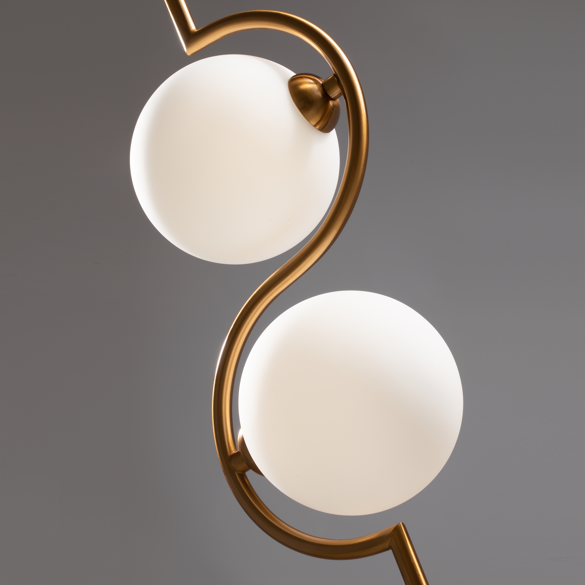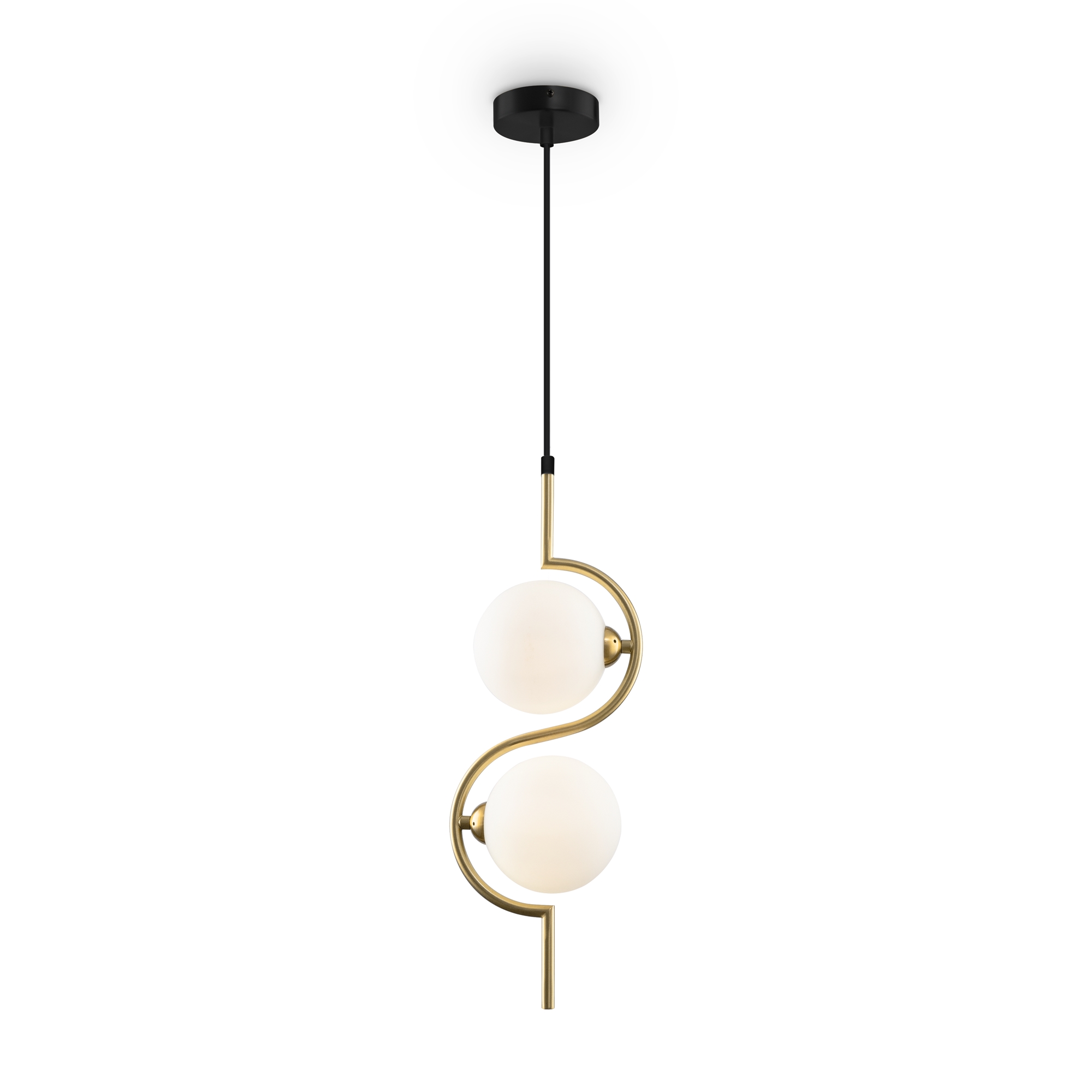 Металлическая арматура, цвет – латунь. Плафоны-сферы из белого матового стекла для мягкого света. Дизайн наполнен метафорическим смыслом плавных контуров символики инь и ян. Источник света – лампа с цоколем G9. Регулируемая высота подвесного светильника.