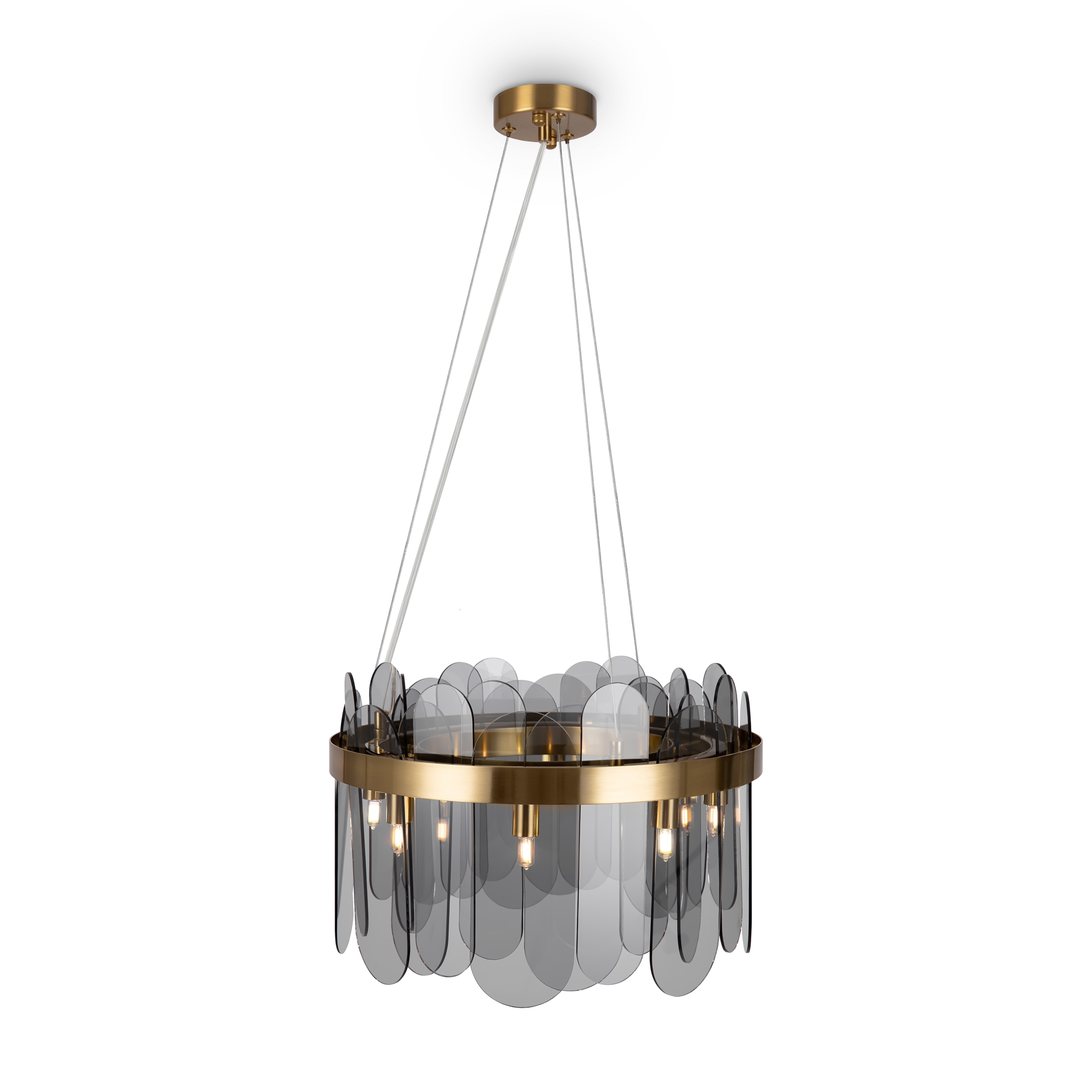 Арматура из металла. Цвет – латунь и никель. Стеклянный декор в двух вариантах: фактурный с эффектом «замороженного стекла» и глянцевый дымчатого оттенка. Источник света – лампа G9.