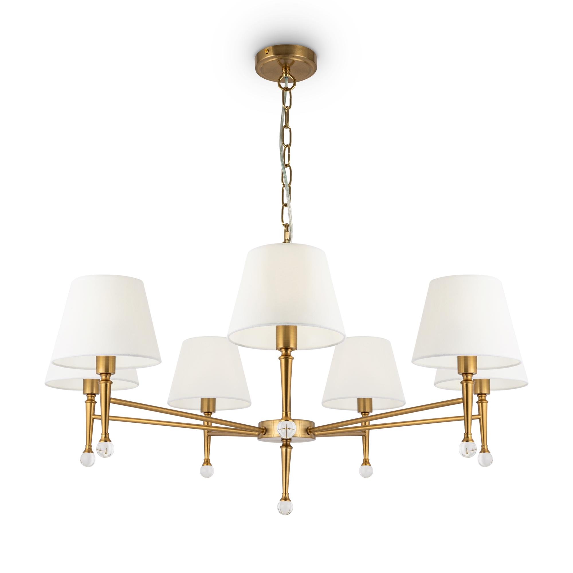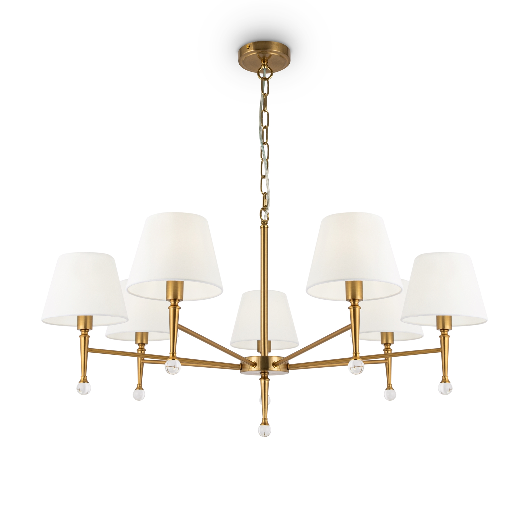 Арматура — металл, плафоны — стекло. Цветовые комбинации арматуры и плафона: черный + прозрачный, черный + янтарный, латунь + прозрачный. Элементы декора — выдувные «бусины» из стекла. Высота проводов регулируется. Источник света — лампа с цоколем GU10.