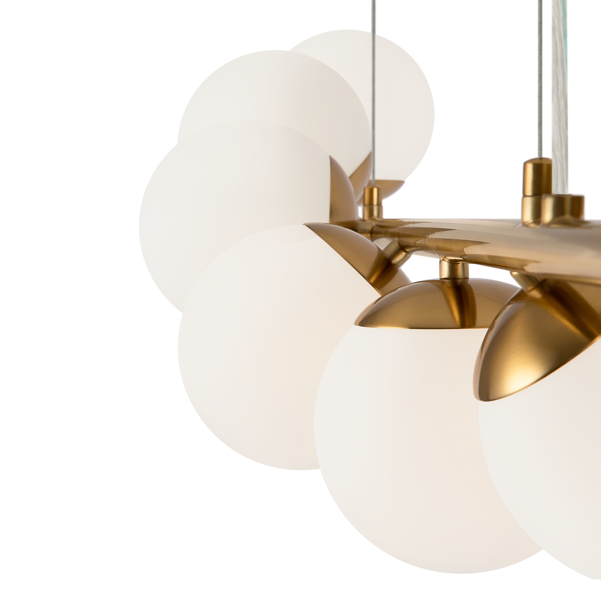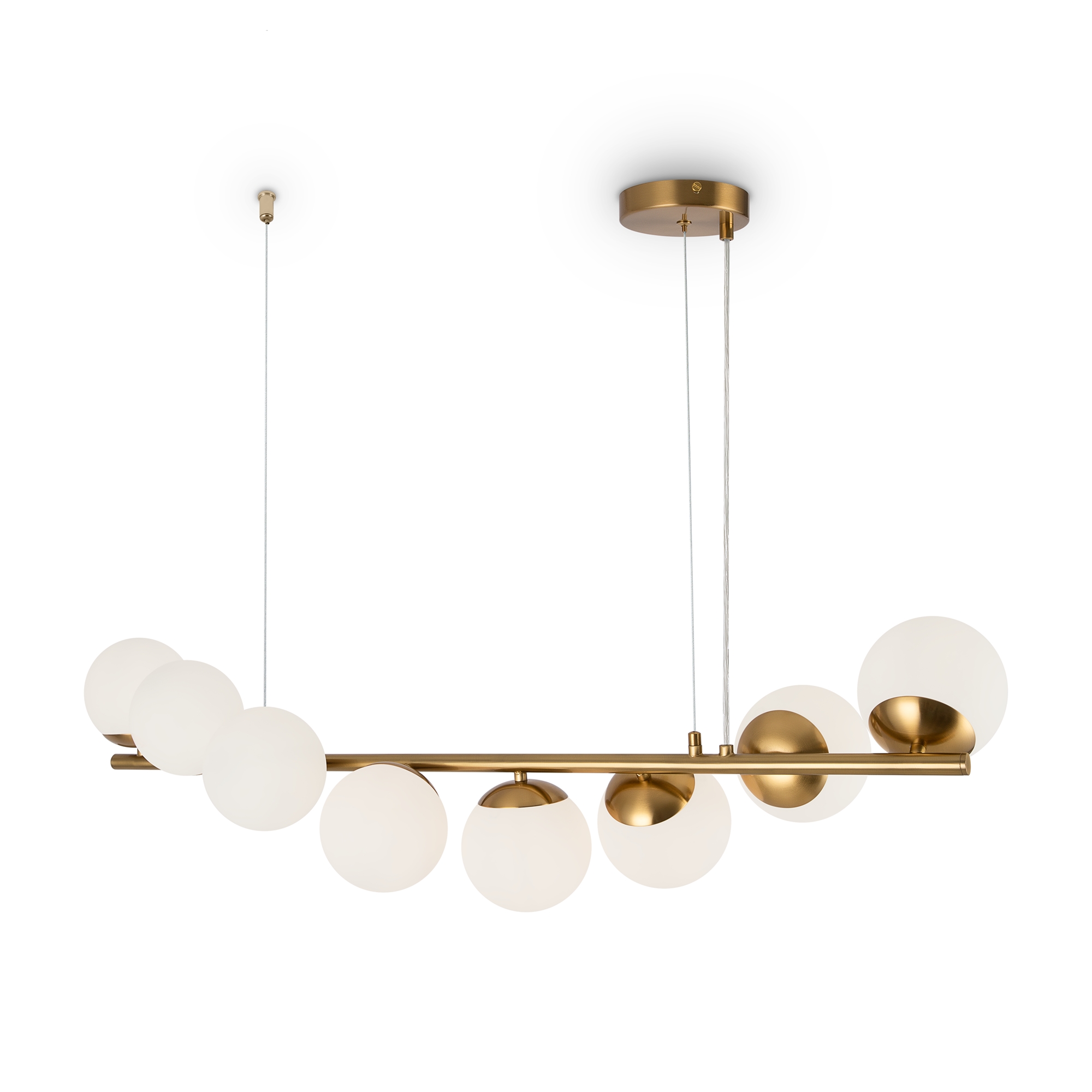Металлическая арматура. Оттенок – латунь. Плафоны-сферы из матового стекла. Оригинальное конструктивное решение: плафоны размещены на горизонтальной или вертикальной планке. Источник света – лампа с цоколем Е27.