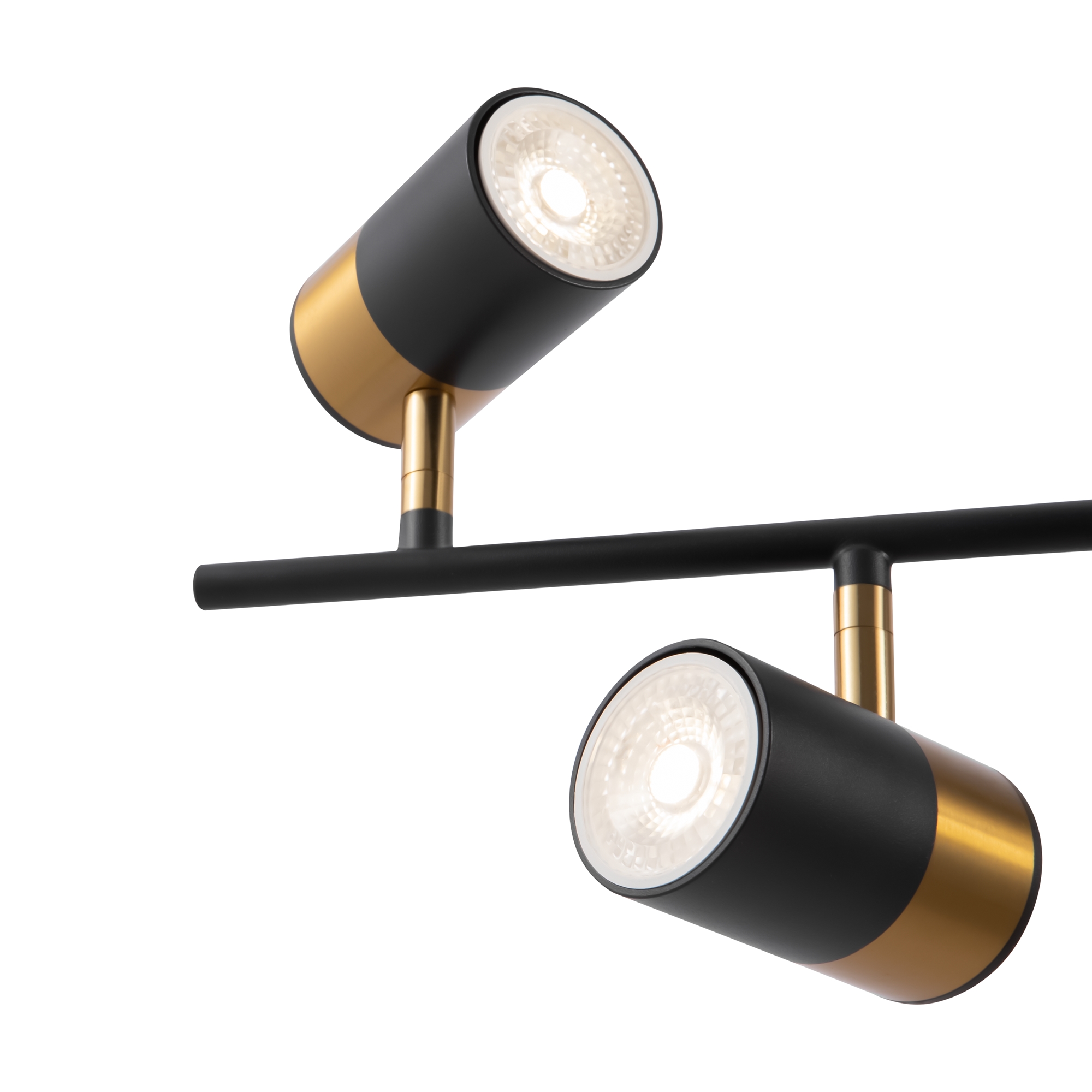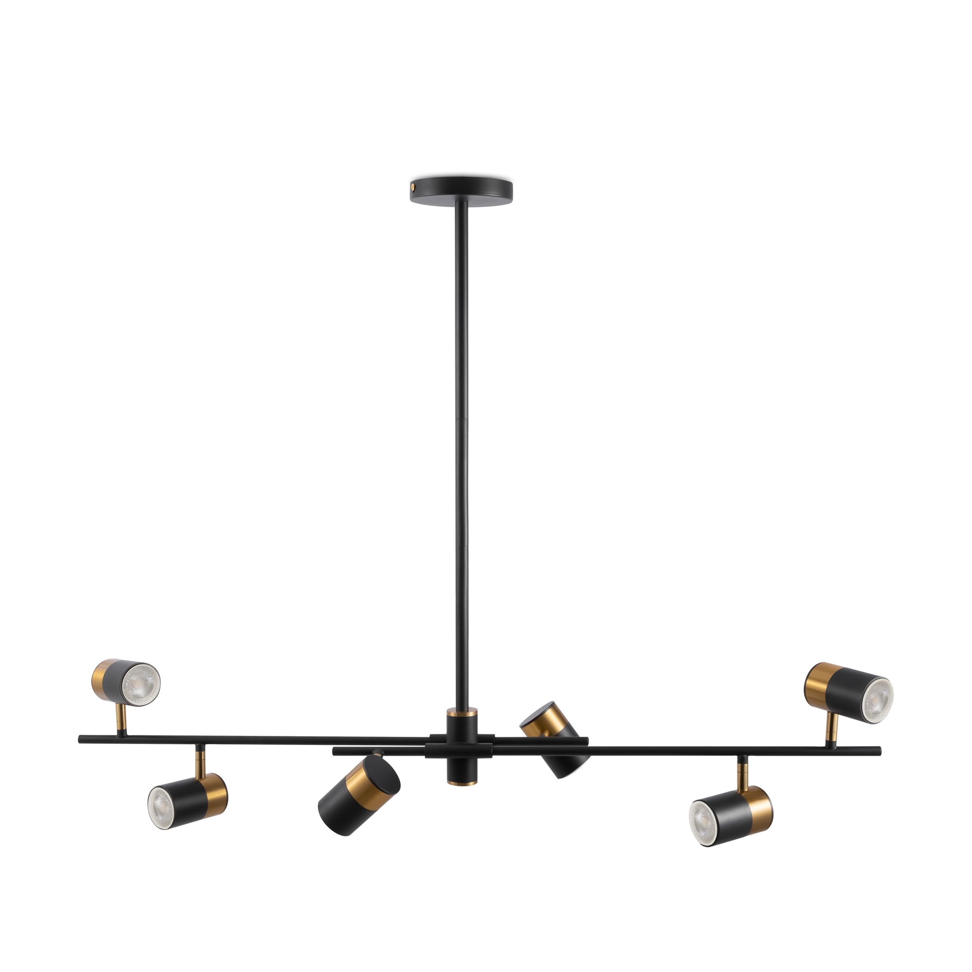 Арматура и плафоны из металла. Черный цвет дополнен латунной окантовкой. Поворотные плафоны и арматура позволяют видоизменять композицию и регулировать направление светового потока. Источник света – лампа GU10.