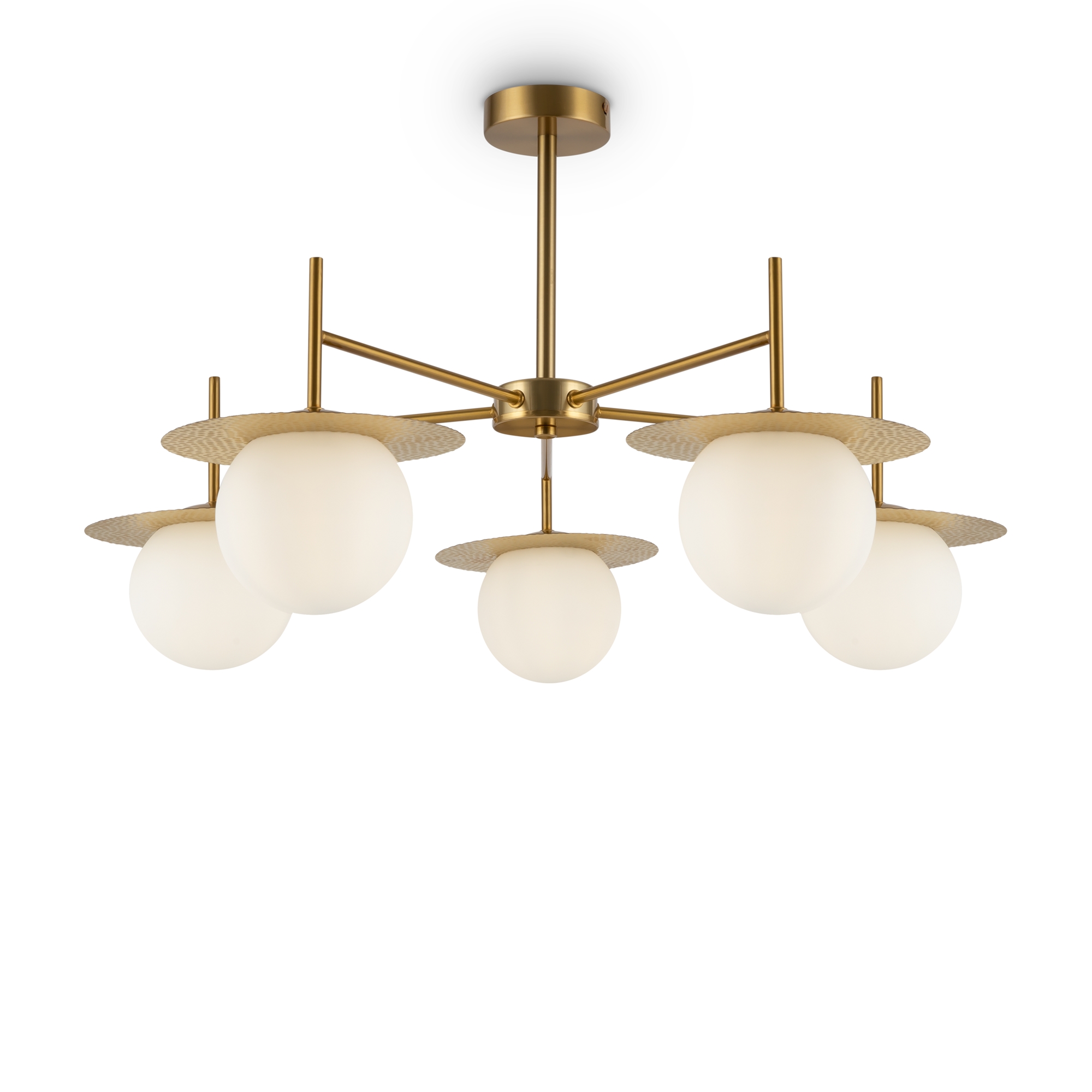 Арматура из металла, цвет – латунь. Плафоны сферической формы из матового белого стекла. Плоские розетки с эффектом чеканки. Трендовый микс фактур. Источник света – лампа с цоколем Е27.