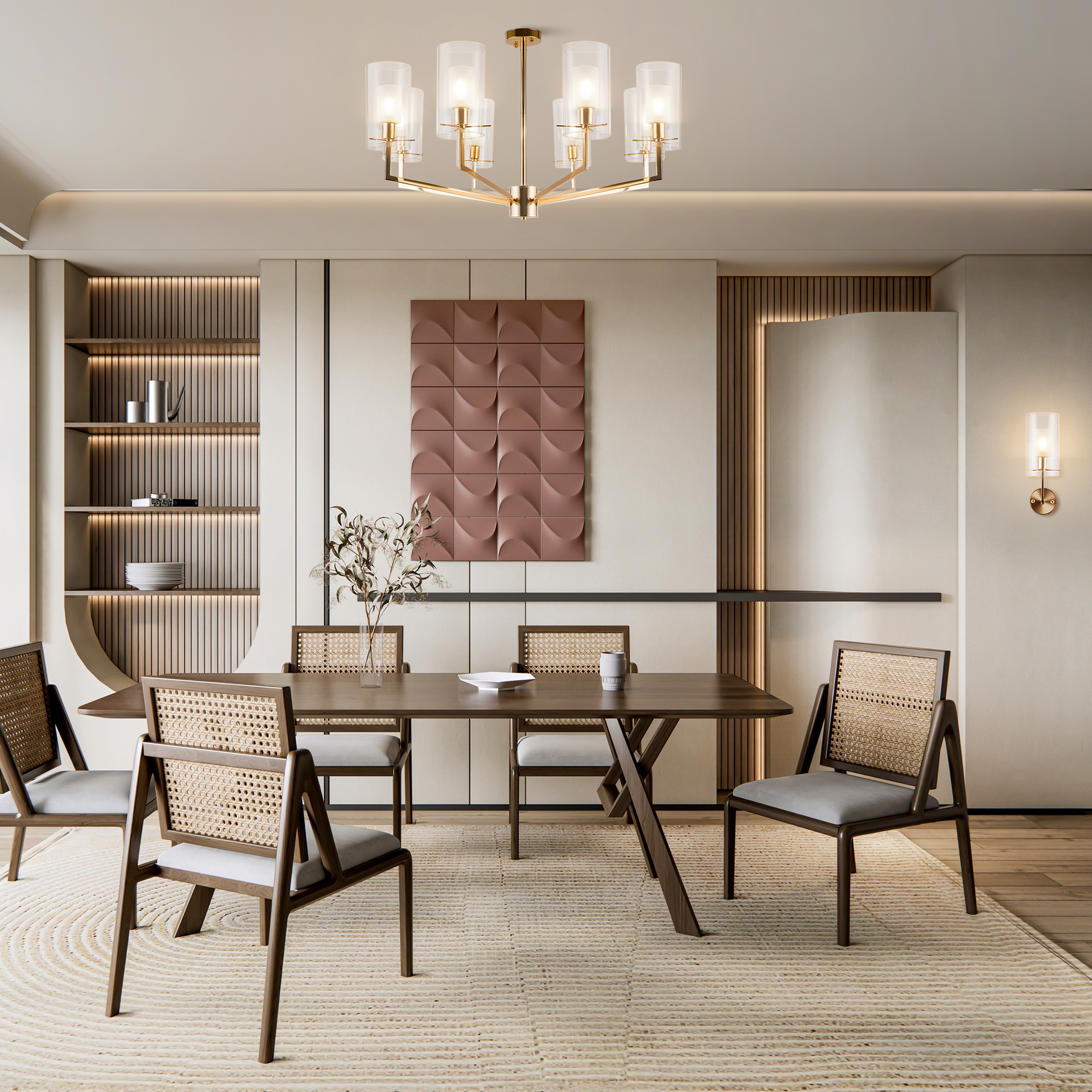 Металлическая арматура оттенка французского золота. Двойные стеклянные плафоны: матовые внутри, прозрачные снаружи. Лаконичная геометрия с симметричным расположением элементов. Источник света – лампа с цоколем E14.