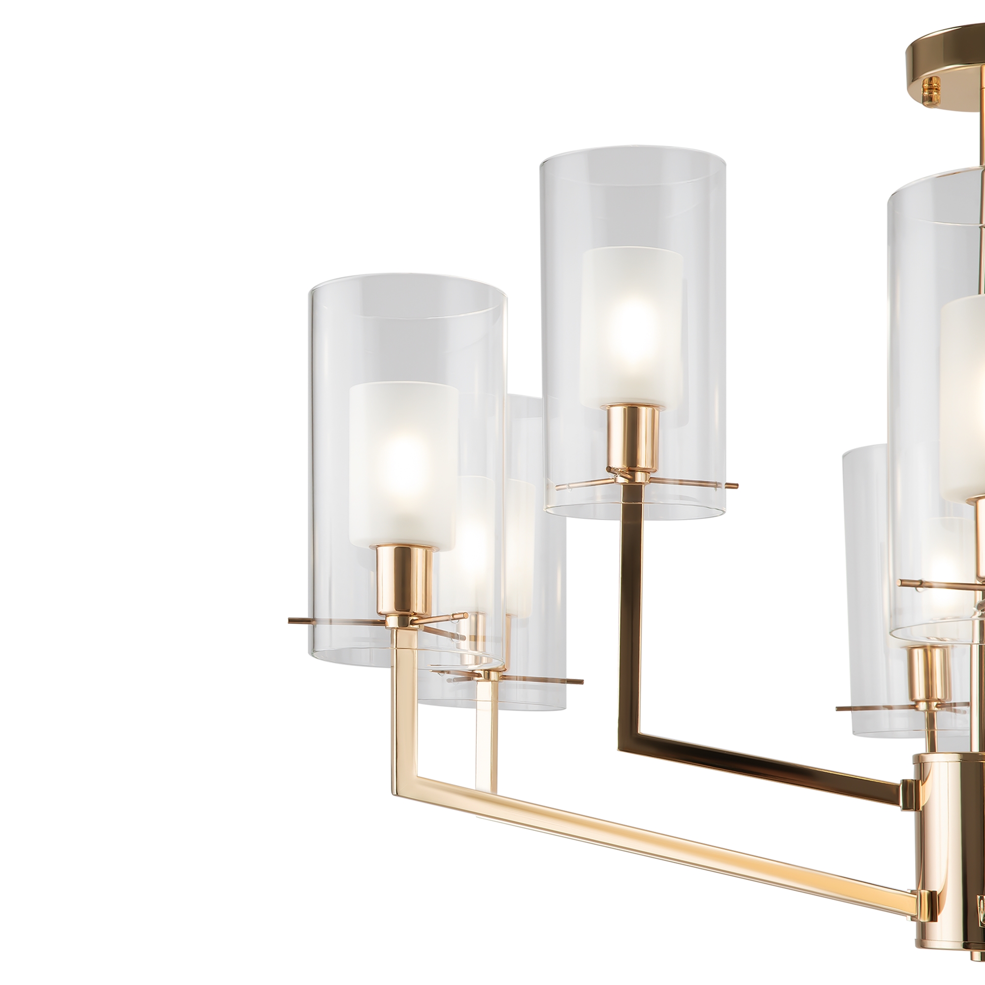 Металлическая арматура оттенка французского золота. Двойные стеклянные плафоны: матовые внутри, прозрачные снаружи. Лаконичная геометрия с симметричным расположением элементов. Источник света – лампа с цоколем E14.