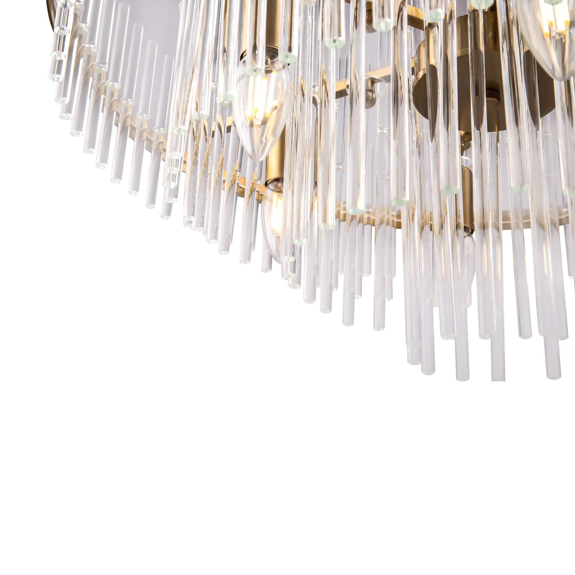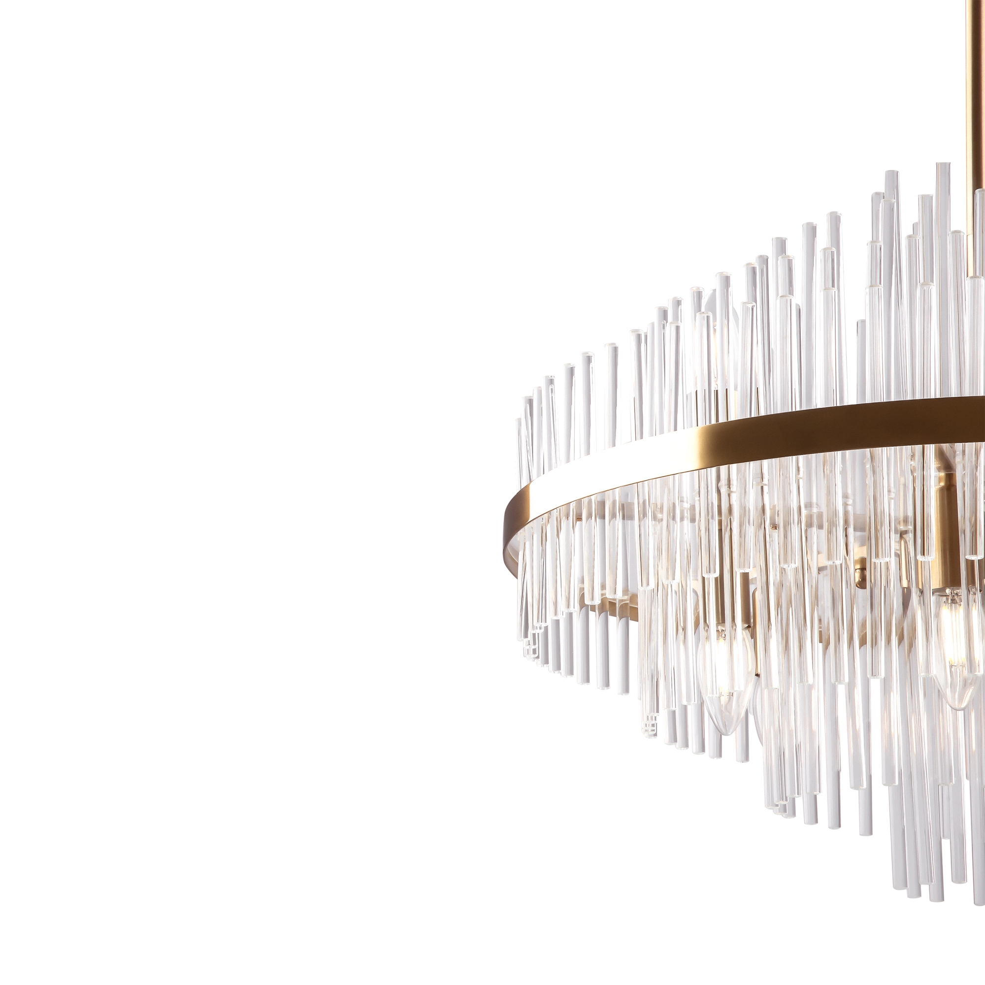 Металлическая арматура, цвет — латунь. Декоративные элементы — прозрачные стеклянные трубки, обрамленные в металлической кольцо в тон арматуре. Источник света — лампа с цоколем Е14.