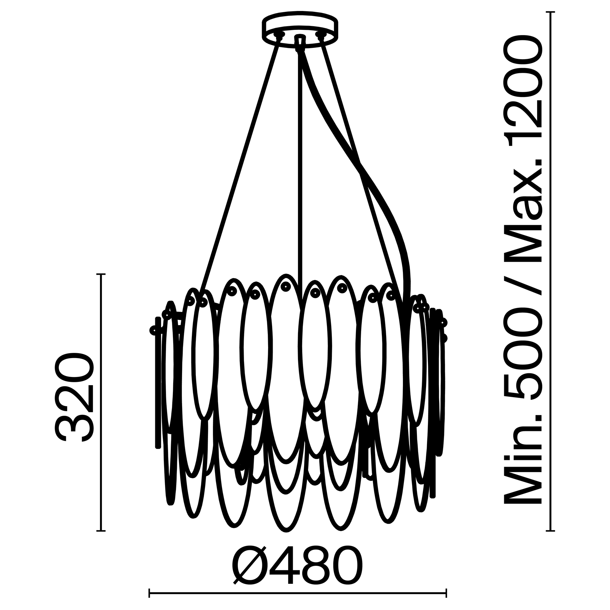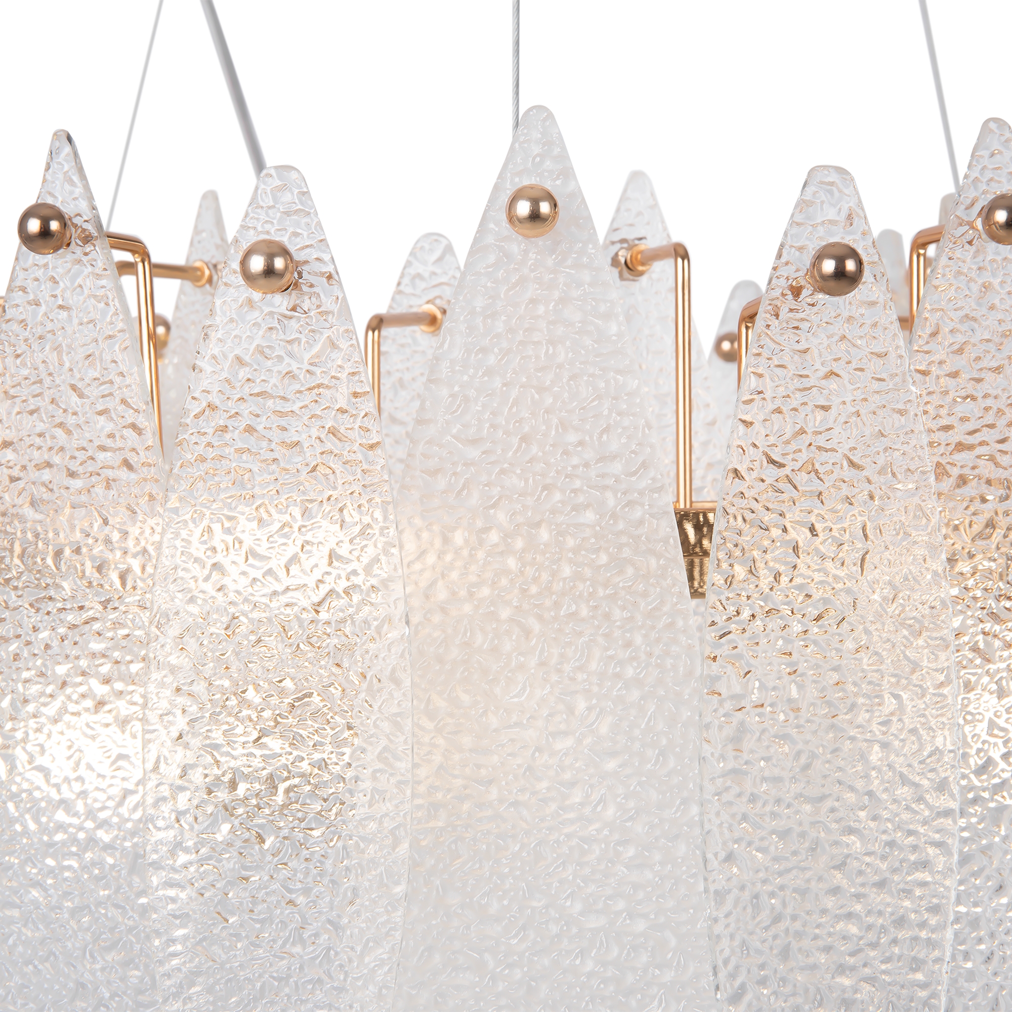 Металлическая арматура, цвет – французское золото. Декоративные элементы выполнены из прозрачного стекла в форме пестрых лепестков ледяной фактуры. Источник света – лампы с цоколем Е14, которые скрыты за декоративными подвесками, размещенными на металлической окружности. Высота подвесов регулируется.