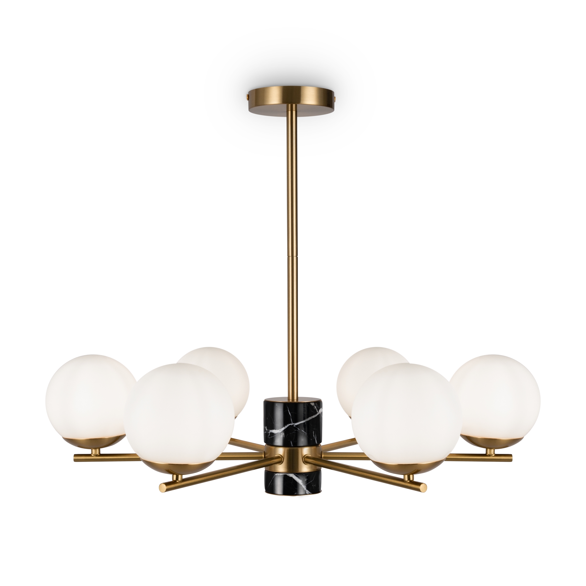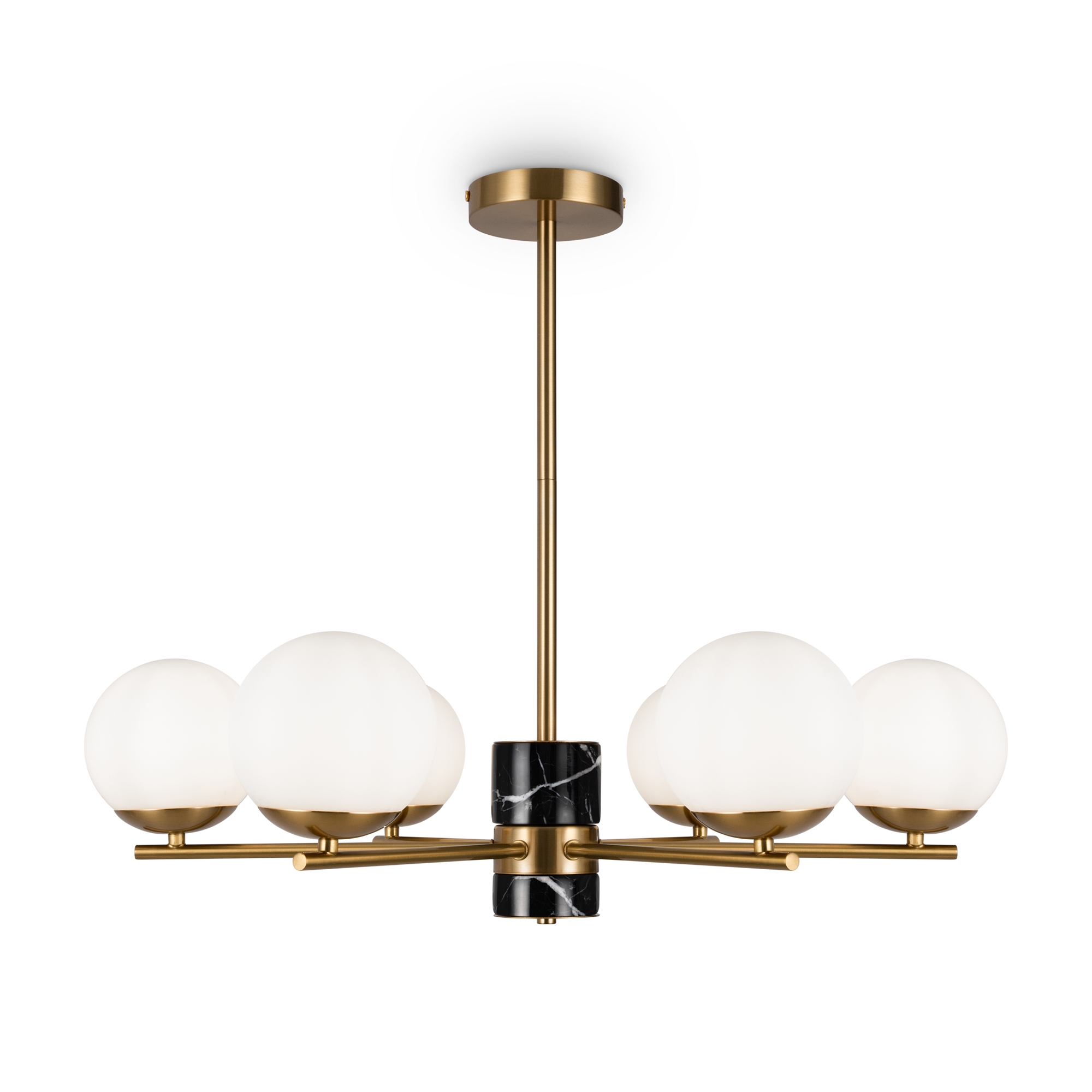 Арматура — металл, цвет — латунь. Мраморные черные элементы в основании. Плафоны-сферы из белого матового стекла с металлической апликацией у основания крепления в цвет арматуры. Сменямый источник света — лампы с цоколем Е27.