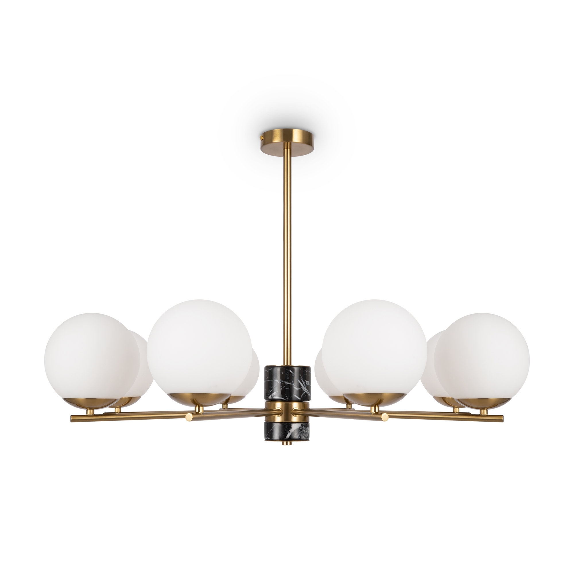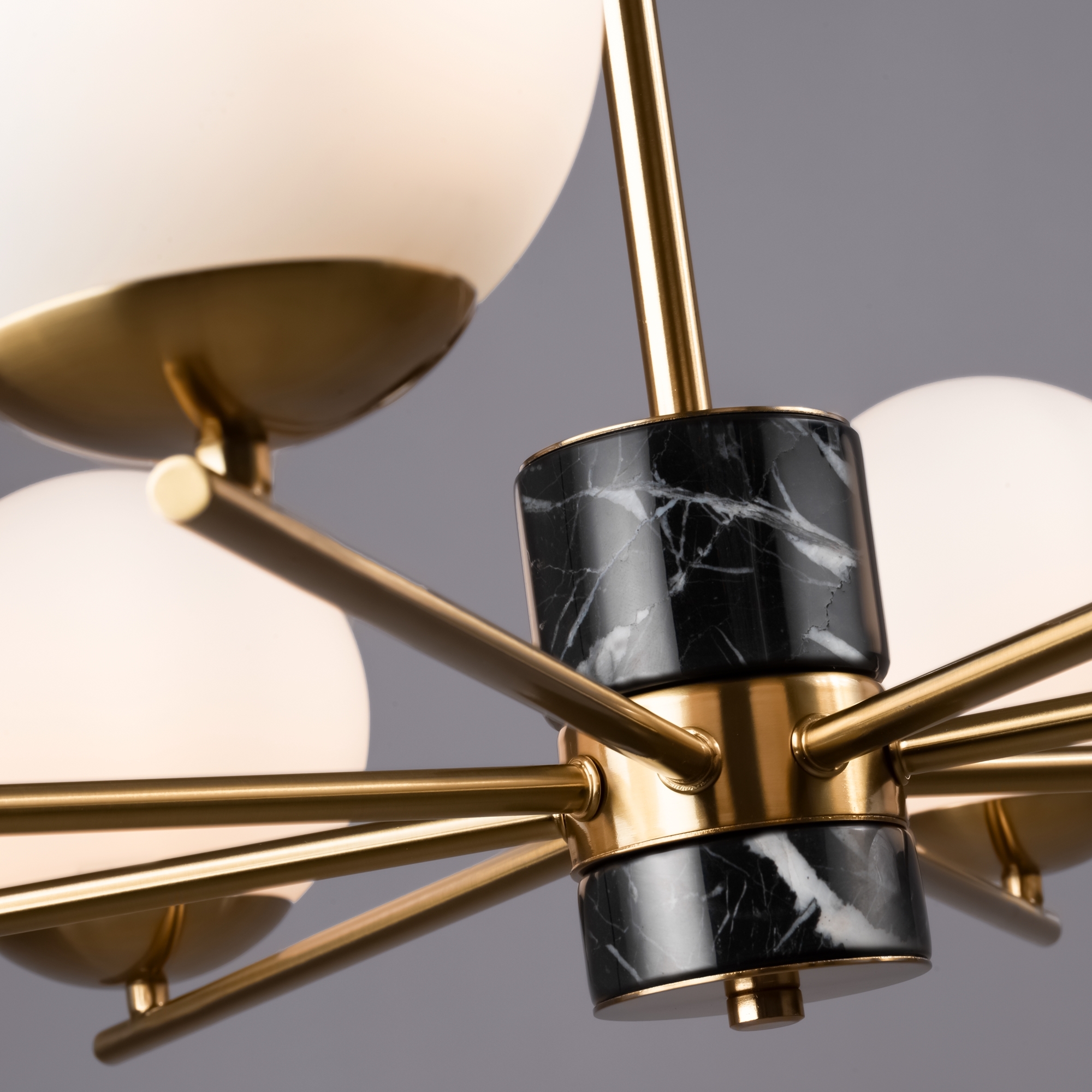 Арматура — металл, цвет — латунь. Мраморные черные элементы в основании. Плафоны-сферы из белого матового стекла с металлической апликацией у основания крепления в цвет арматуры. Сменямый источник света — лампы с цоколем Е27.