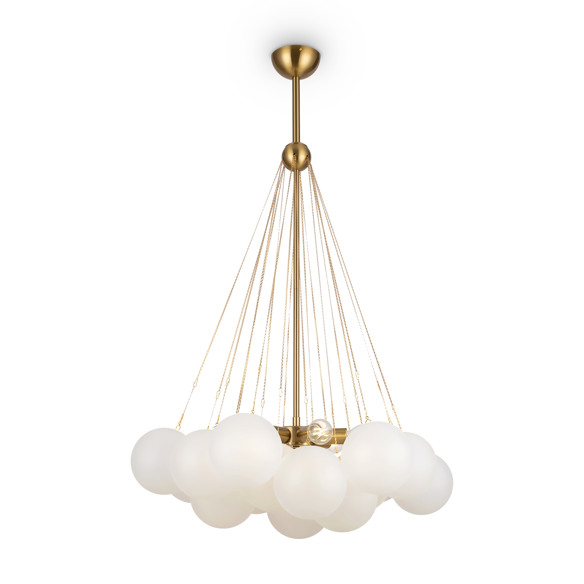 Материал арматуры — металл, цвет — хром/латунь. Подвесные светильники c цоколями E14/E27/G9. Белые стеклянные плафоны с рисунком в виде космических планет крепятся на тонких тросах, которые регулируются по высоте, создавая эффект парящих облаков.