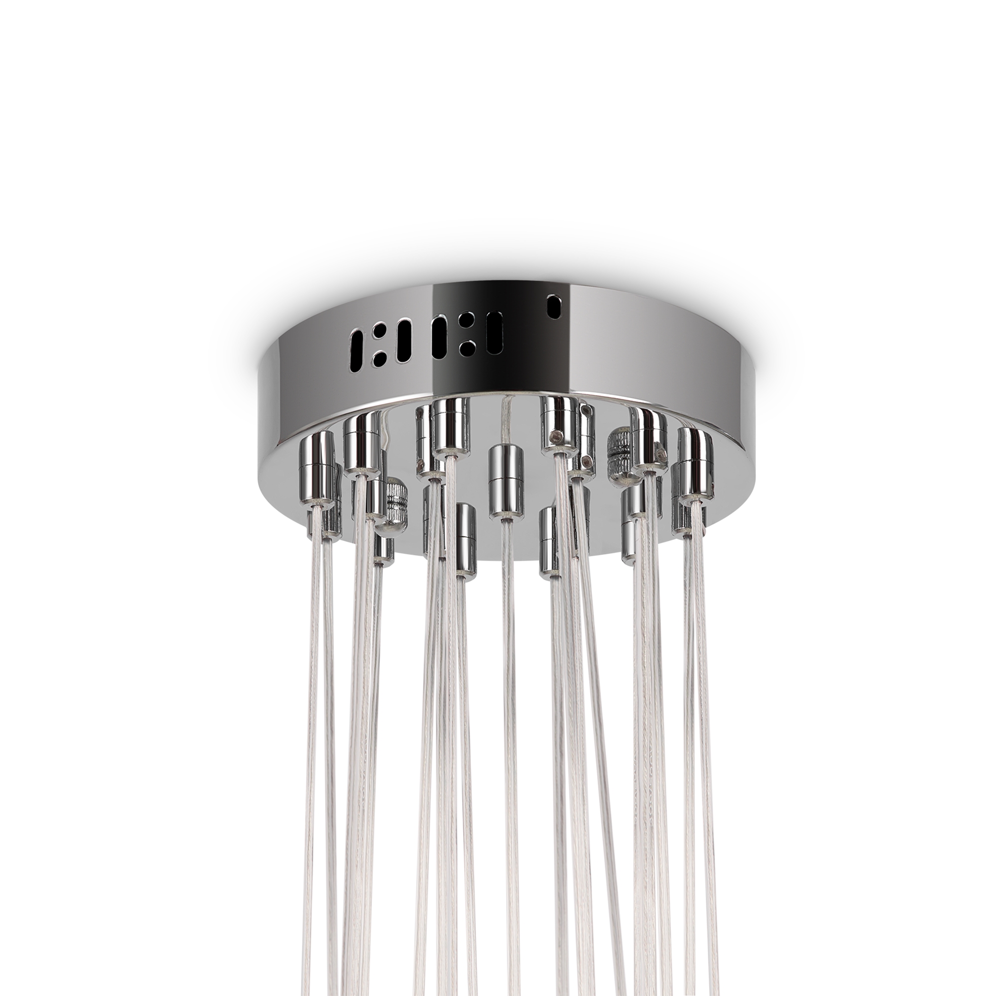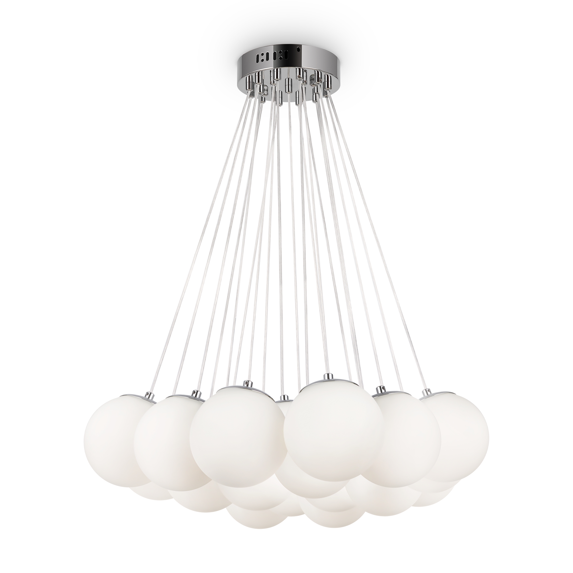 Материал арматуры — металл, цвет — хром/латунь. Подвесные светильники c цоколями E14/E27/G9. Белые стеклянные плафоны с рисунком в виде космических планет крепятся на тонких тросах, которые регулируются по высоте, создавая эффект парящих облаков.