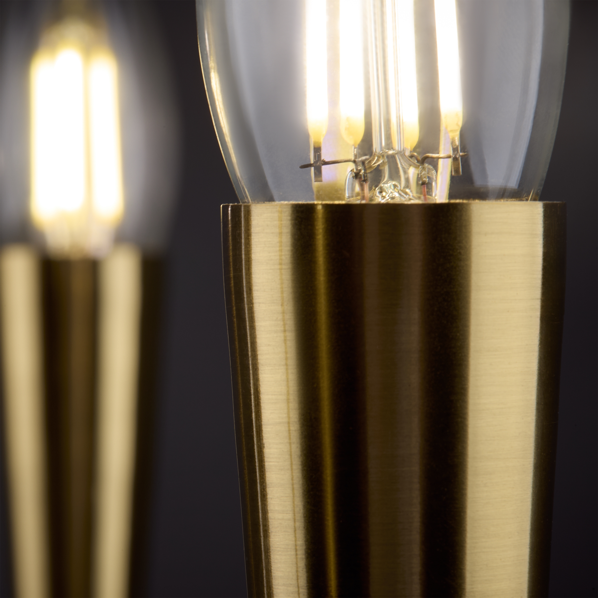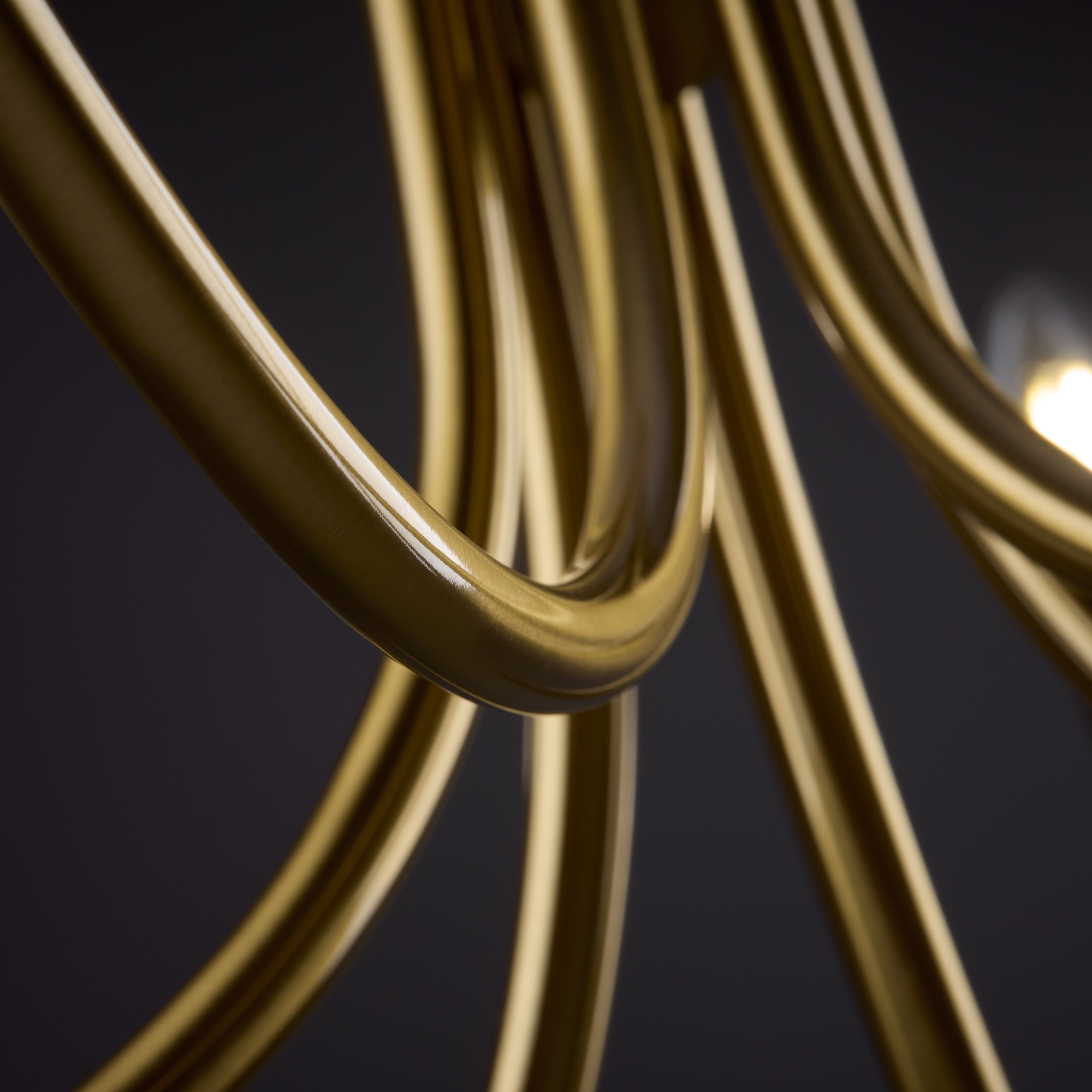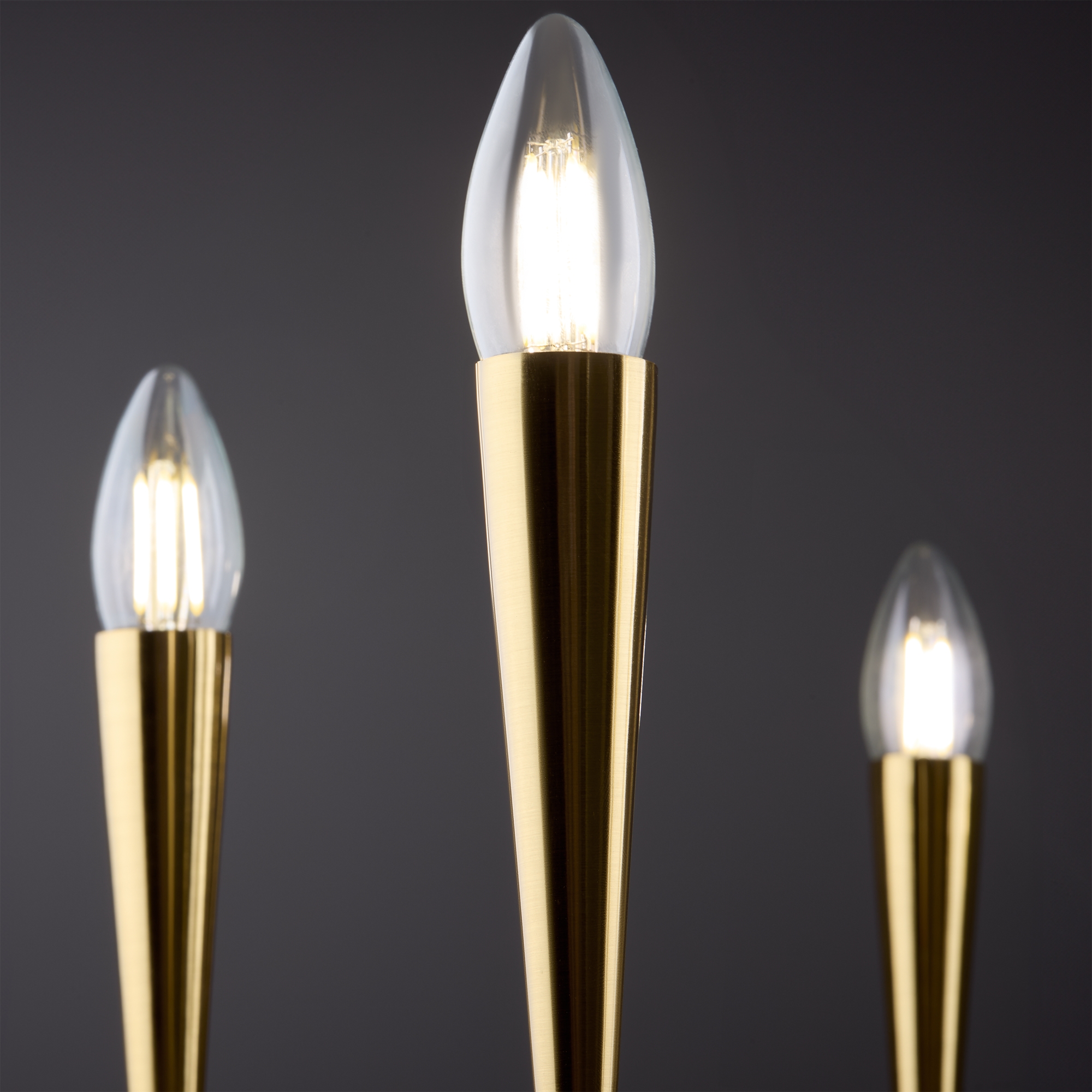 Металлическое основание, цвет — золото. Черная матовая арматура. Регулируемая высота плафонов за счет изменения длины проводов. Овальные плафоны из белого матового стекла с резьбой для удобной самостоятельной замены ламп. Цоколь G9. Лампы в комплект не входят.