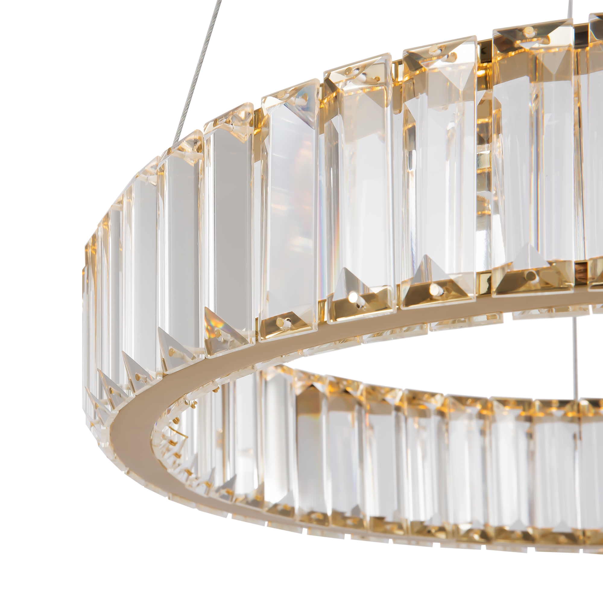 Металлическая арматура в цвете латунь и хром. Хрустальные декоративные кольца с геометричными гранями. LED-источник света. Регулировка цветовой температуры (3000-4000-5000K) и яркости 4G-dimming при помощи пульта (в комплекте).