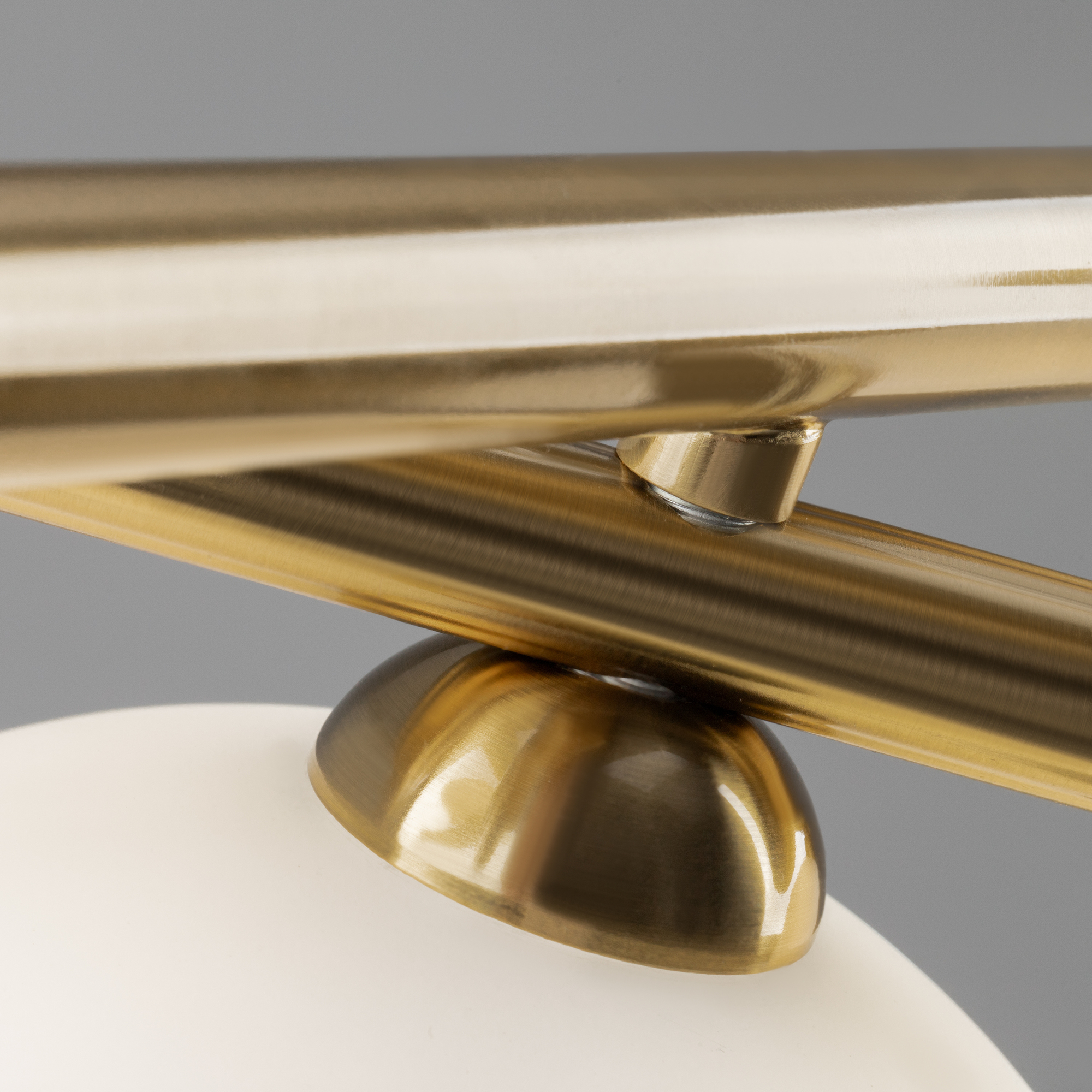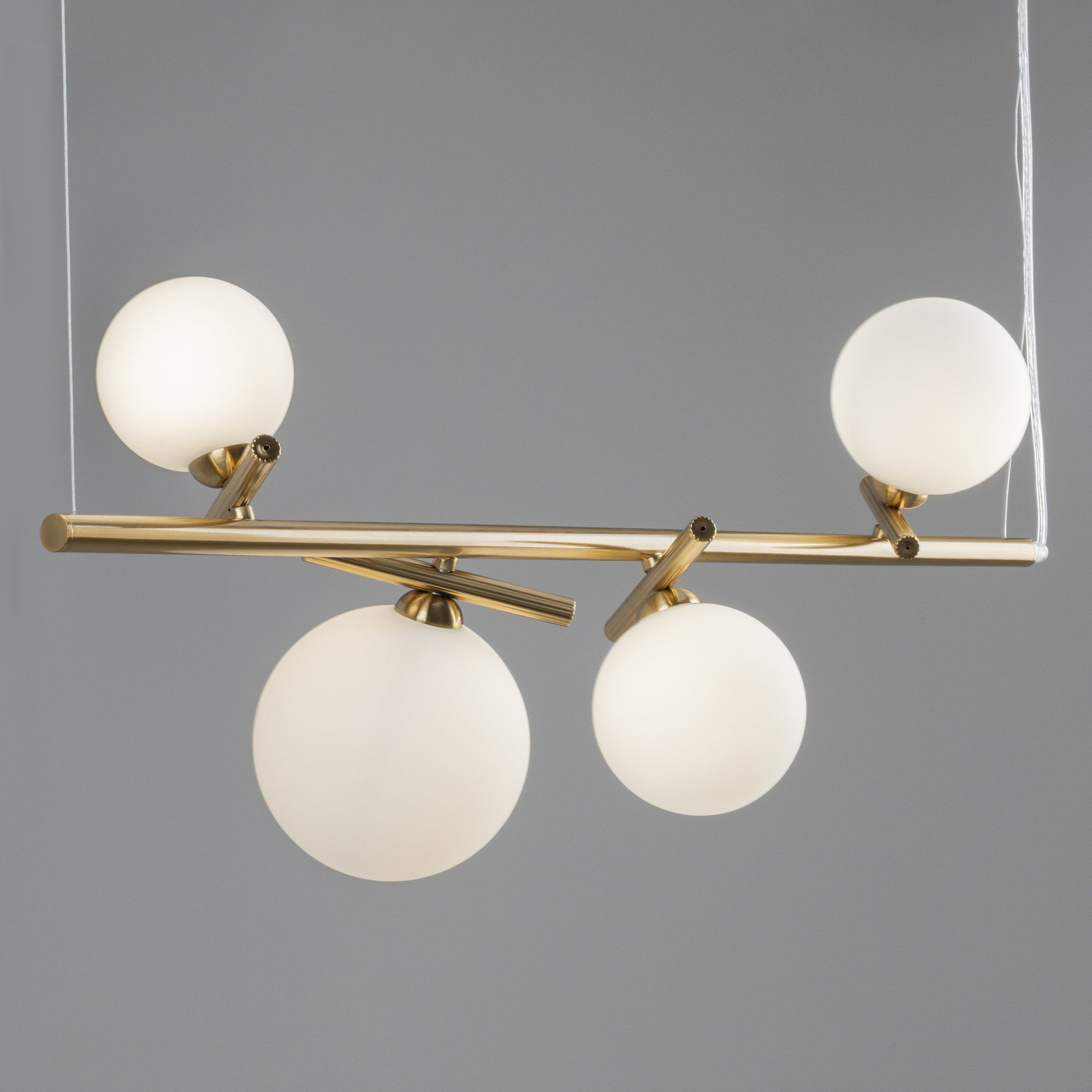 Материал арматуры — рифленый металл, цвет — латунь. Плафоны-сферы из белого матового стекла для мягкого заливающего света. Воздушный образ плафонов, строгие тонкие линии арматуры придадут интерьеру изящество и легкость. Высота подвесов регулируется. Источник света — лампы с цоколем G9.