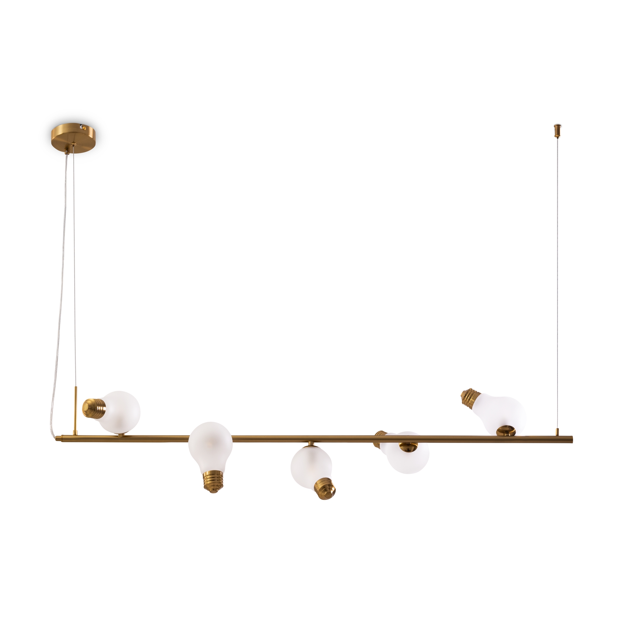 Металлическая арматура, цвета — чёрный и латунь. Прозрачные плафоны-лампочки из стекла в тон арматуры хаотично “разбросаны” по острову светильника. Подвесы регулируются по высоте. Источник света — лампа с цоколем G9.