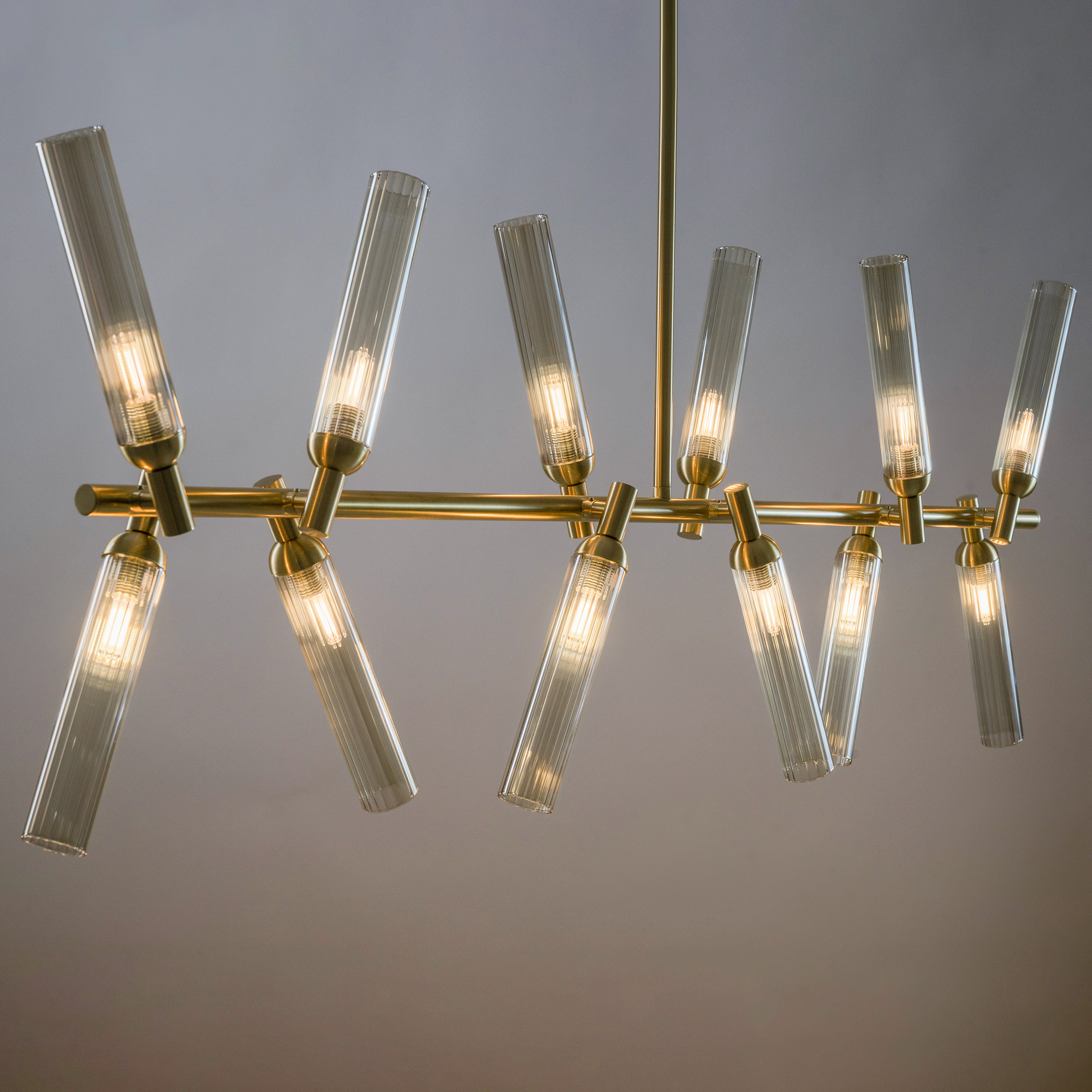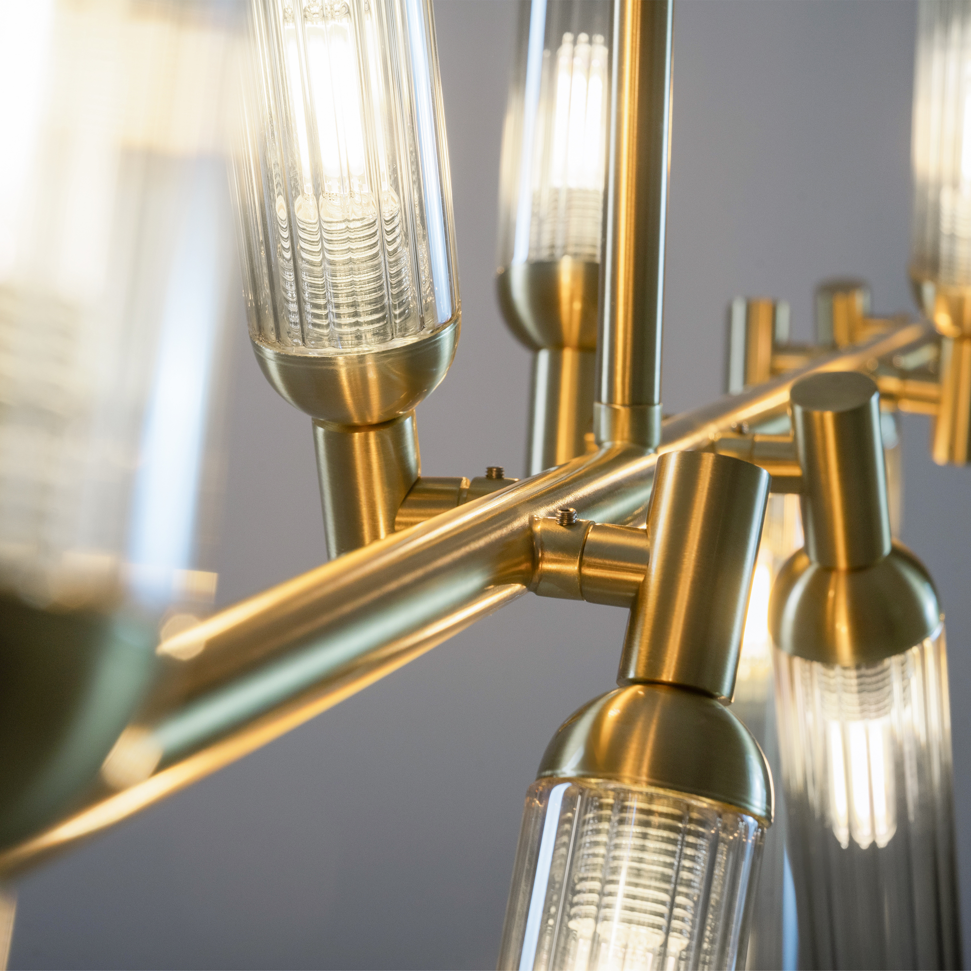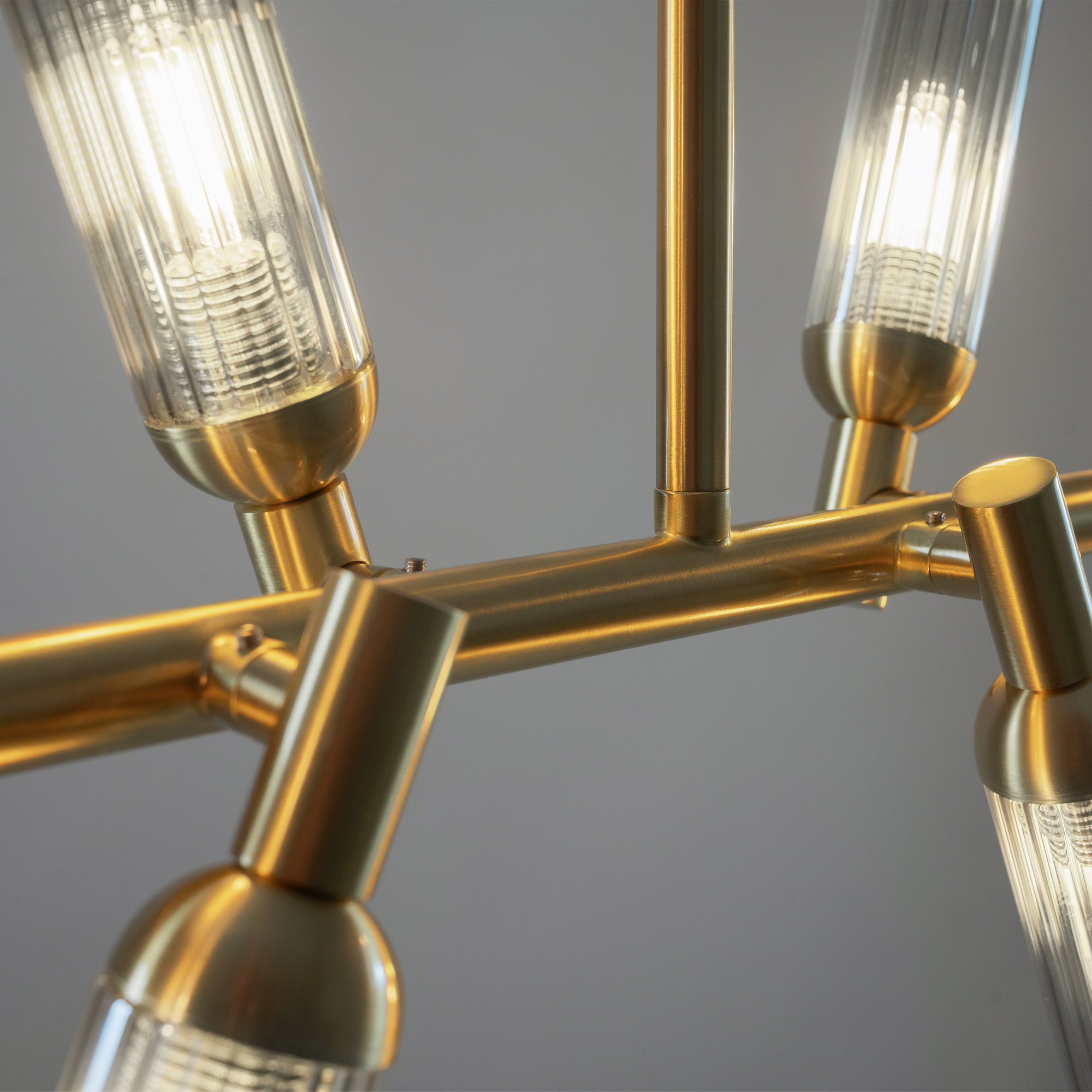 Арматура из металла, цвет — золото. Рельефные плафоны в тренде ZIGZAG. Материал — стекло, цвет — янтарный. Высота подвесных светильников регулируется. Плафоны закреплены на металлическую сферу. Источник света — лампа с цоколем G9.