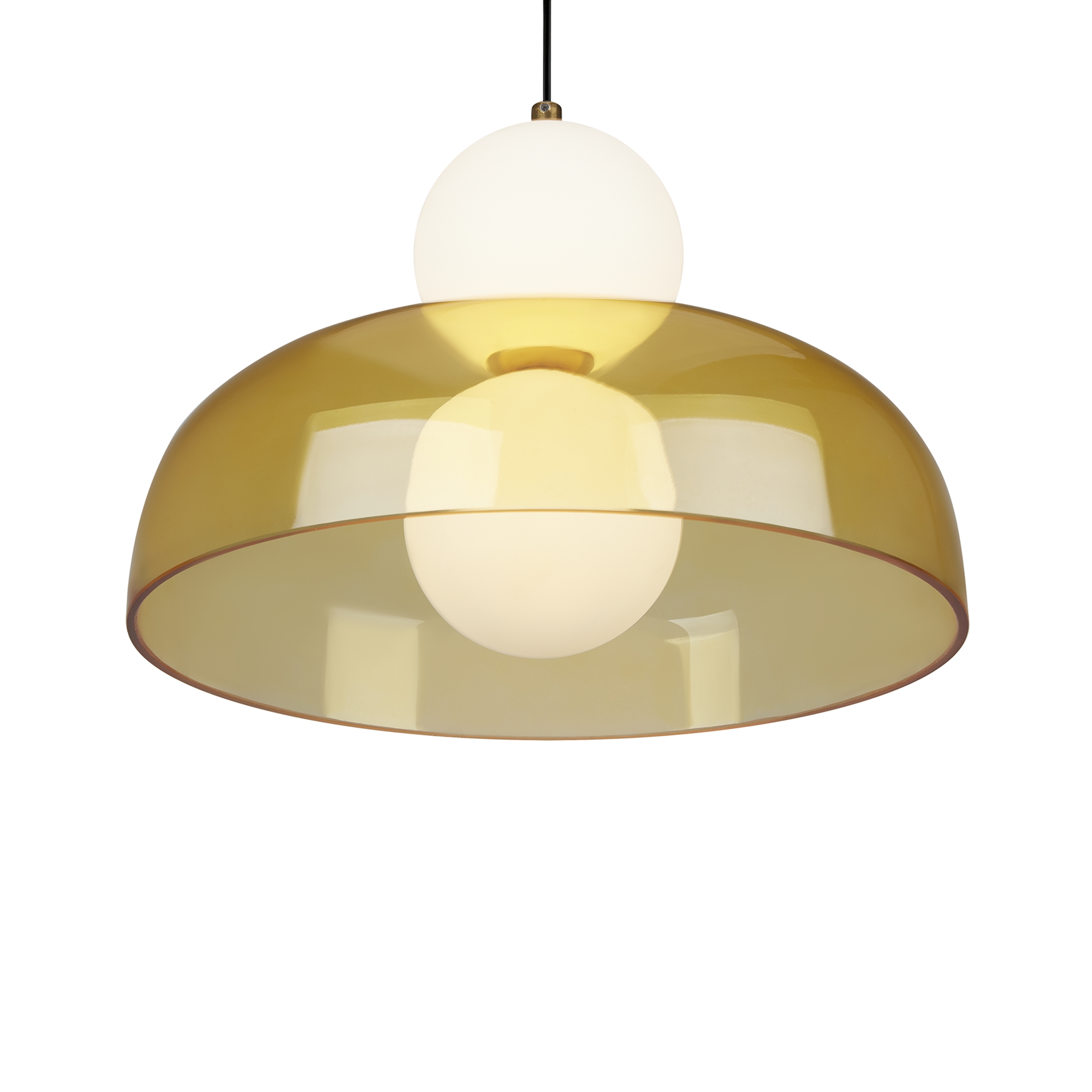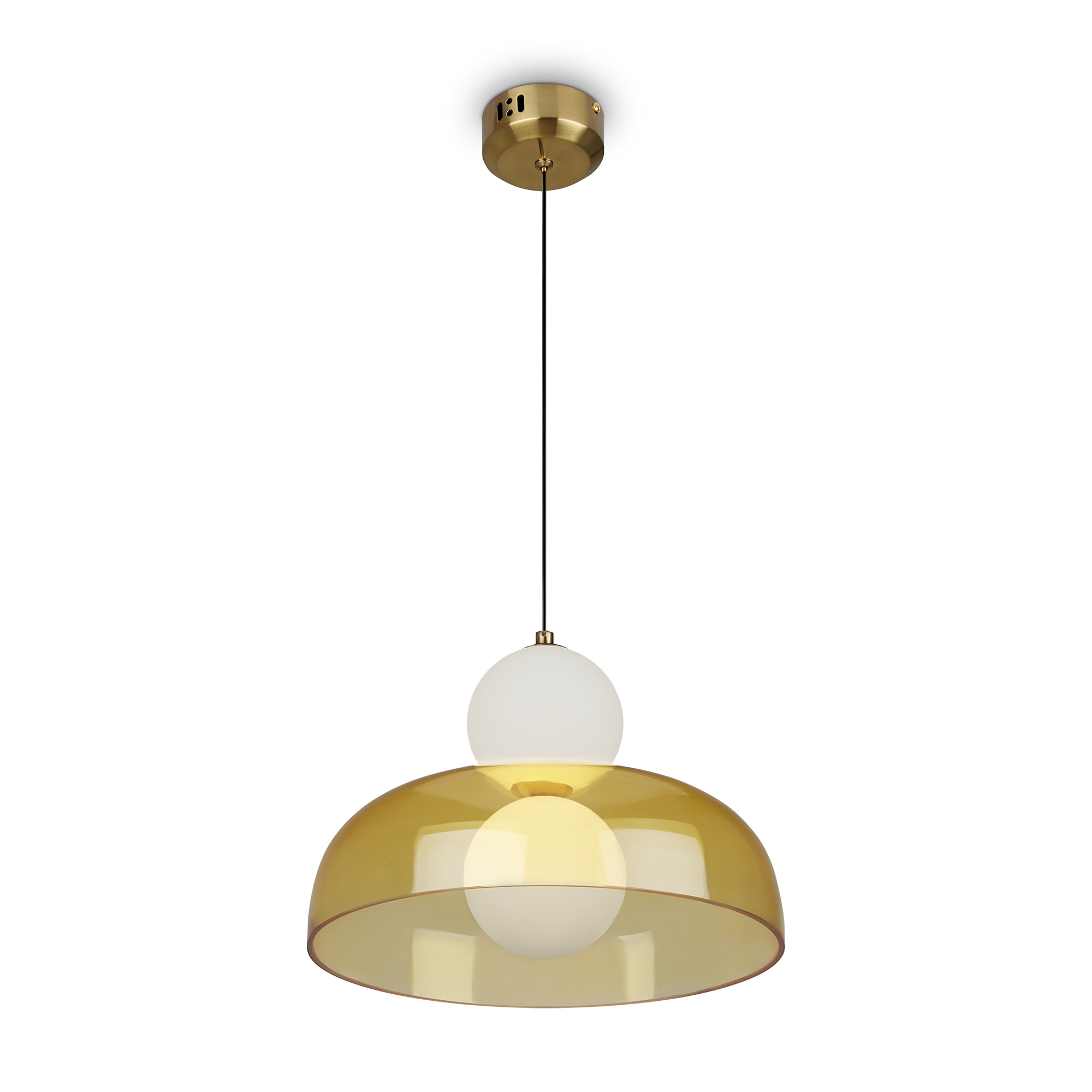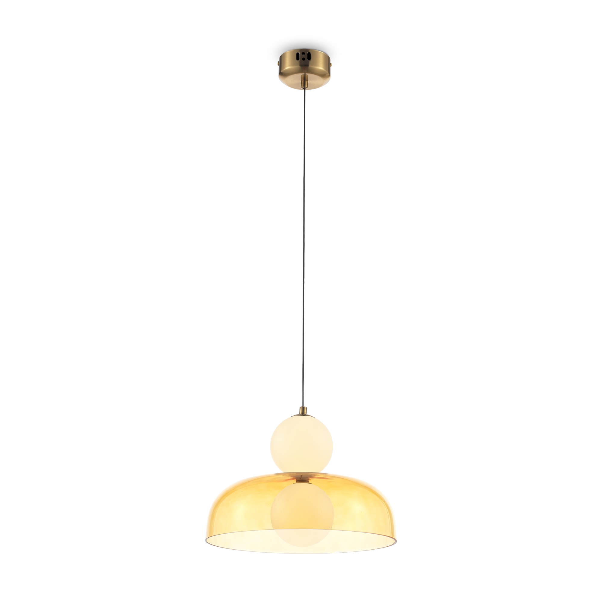 Арматура — металл, цвет — латунь. Стеклянные плафоны в виде сдвоенных матовых “шариков” дополнены широкими декоративными плафонами из стекла двух оттенков: дымчатый и янтарный. LED-источник света. Цветовая температура — 3000К. Светильники подойдут для светлых интерьеров и детских комнат.