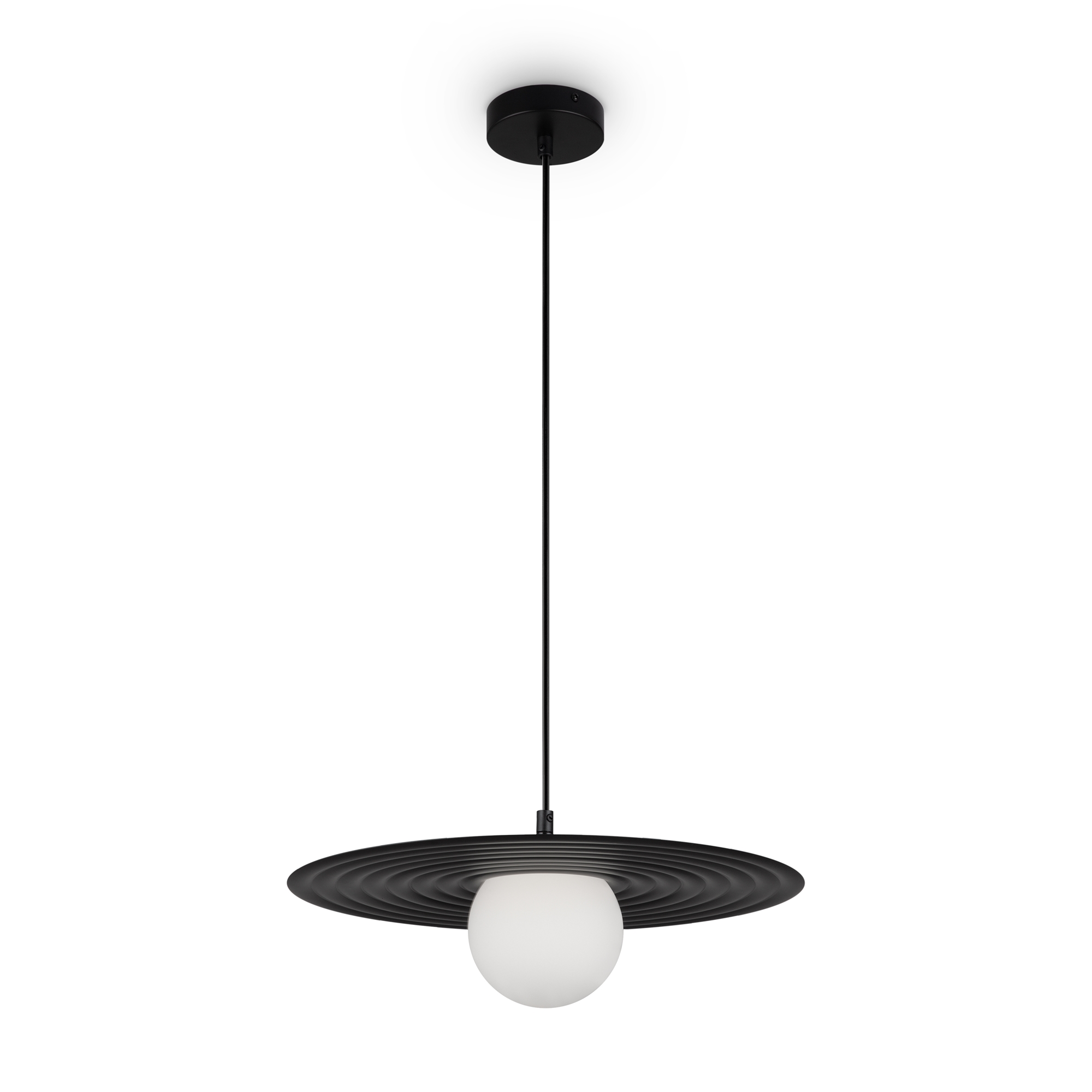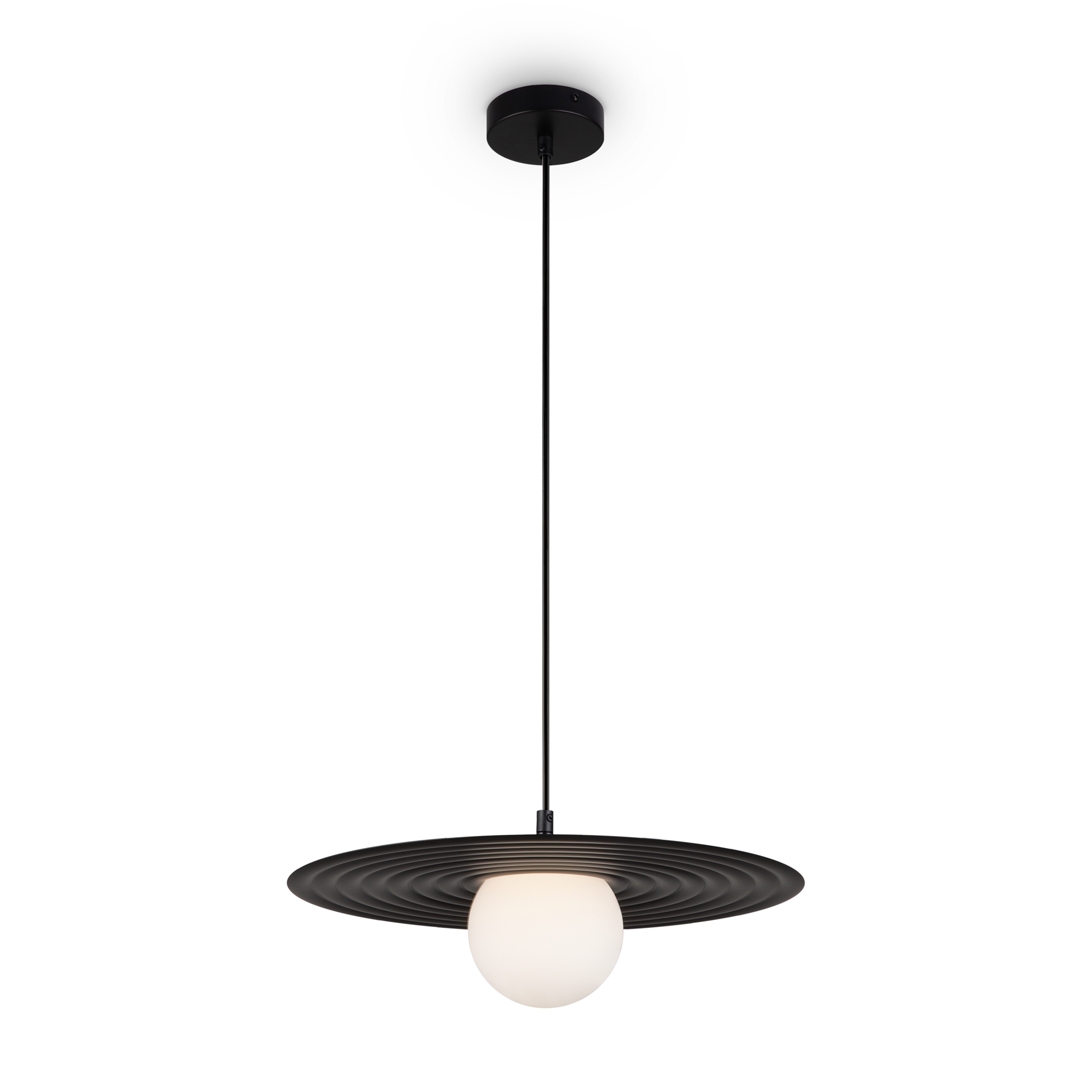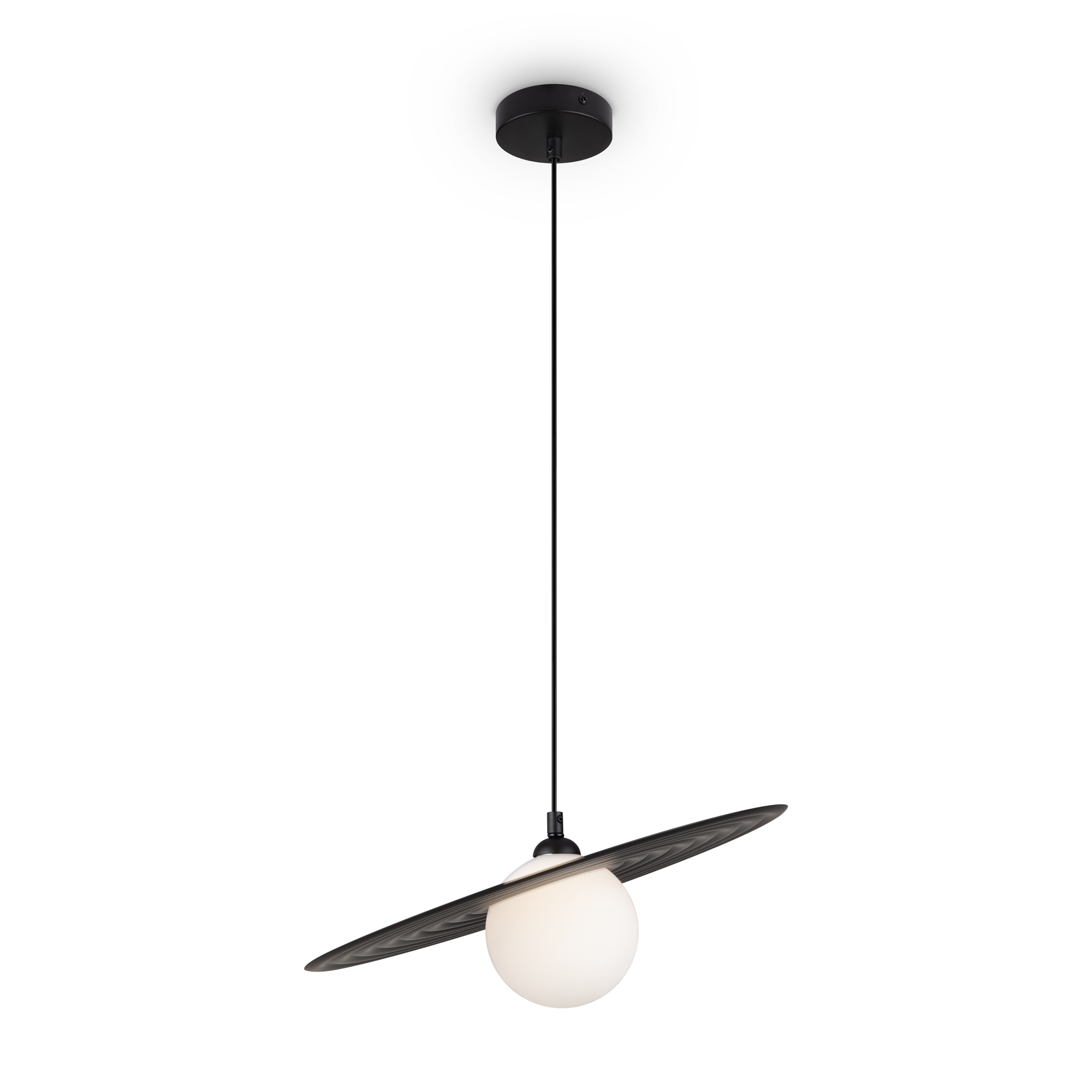 Арматура — металл, цвета — чёрный и белый. Матовый белый плафон с декоративным элементом — металлической тарелкой. Можно регулировать минимальную и максимальную высоту. Лампа с цоколем G9 служит источником света.