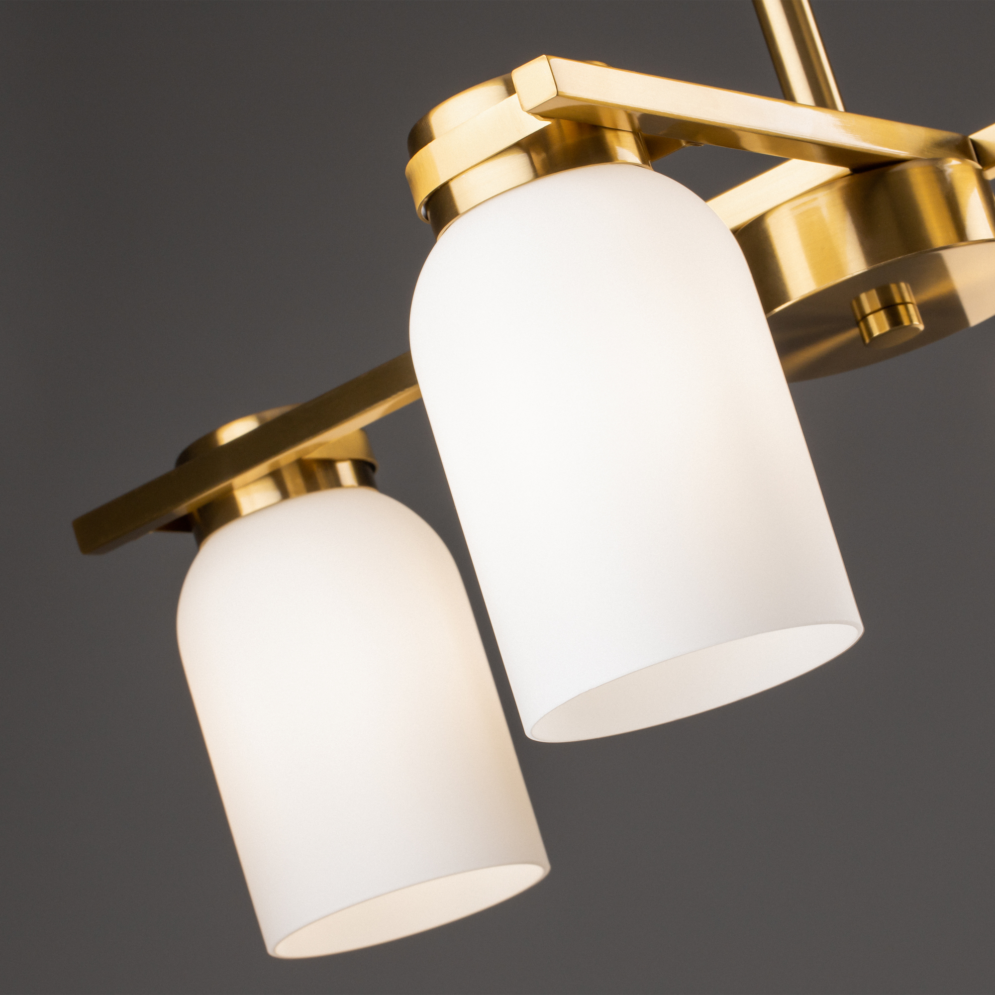 Арматура из металла. Цвет латунь. Плафоны из белого стекла новой необычной формы. Два варианта светильников — потолочные и бра. Подходит для помещений с низкими потолками. Источник света — лампа. Цоколь E14.