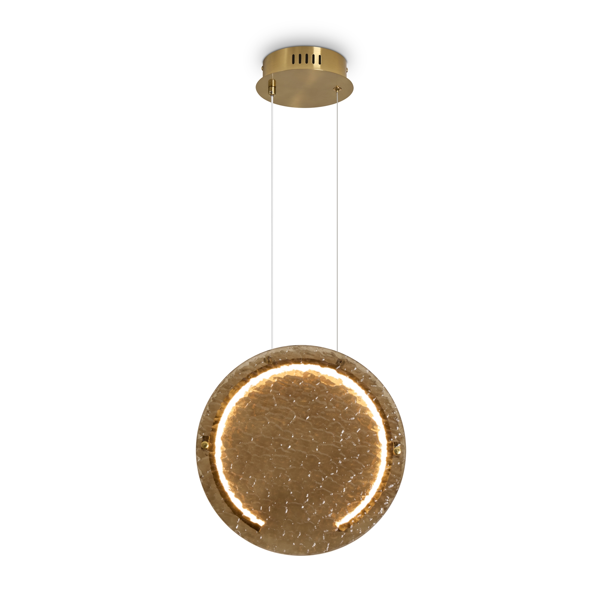 Материал арматуры — металл, цвет — латунь. Настенные светильники оснащены LED-источником света с цветовой температурой 2700К. Уникальное стекло ручного производства обеспечивает равномерное свечение всей поверхности плафона. Для достижения наилучшего светового эффекта рекомендуется использовать в сочетании с основными источниками света.