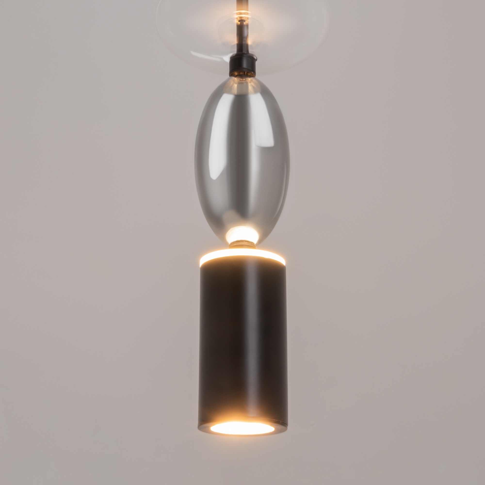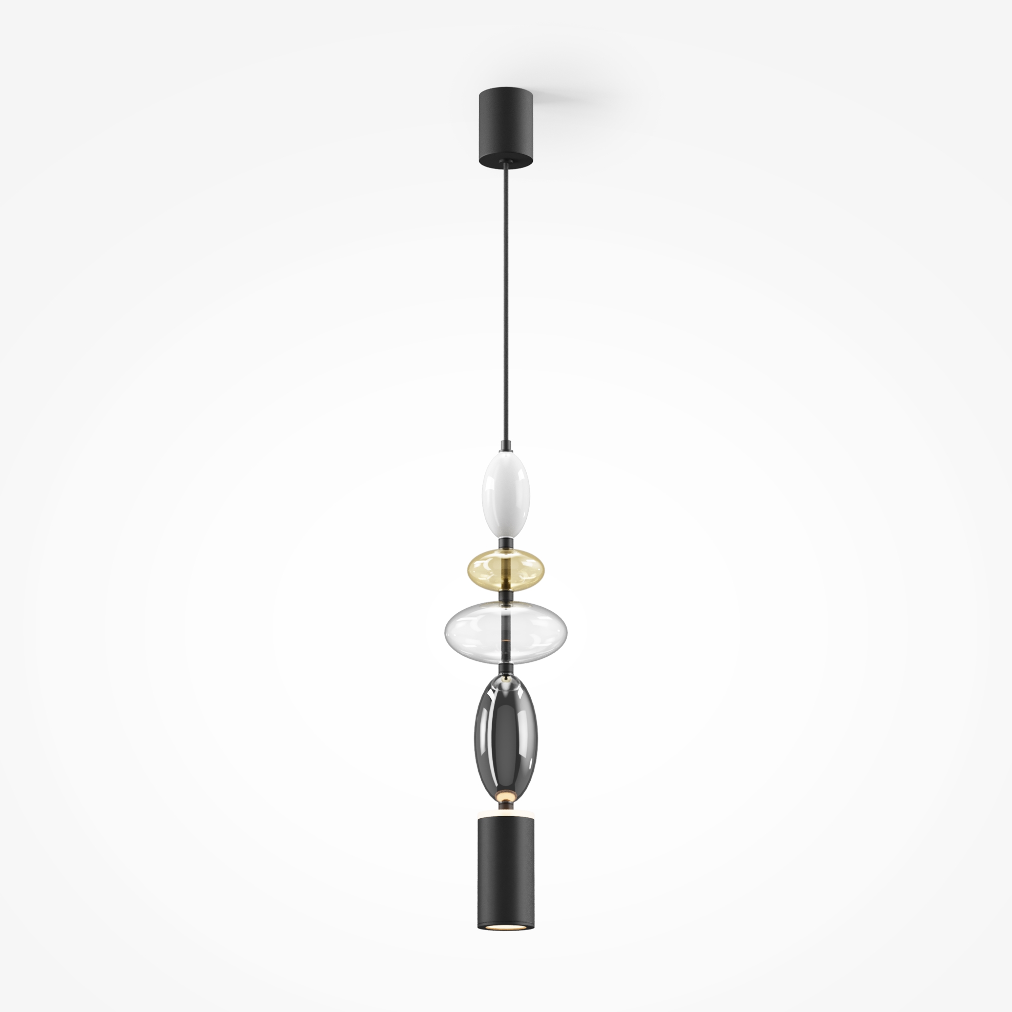 Черная металлическая арматура. Плафоны из стекла коньячного, белого, дымчатого цвета и прозрачный. Источник света комбинированный: нижний — съемная лампа с цоколем GU10, верхний — встроенный LED. Цветовая температура светильников 2700К, угол рассеивания света 120 градусов. Высота регулируется с помощью провода длиной 3 м. Монохромный дизайн, стеклянные элементы впишутся в различные стили интерьеров.