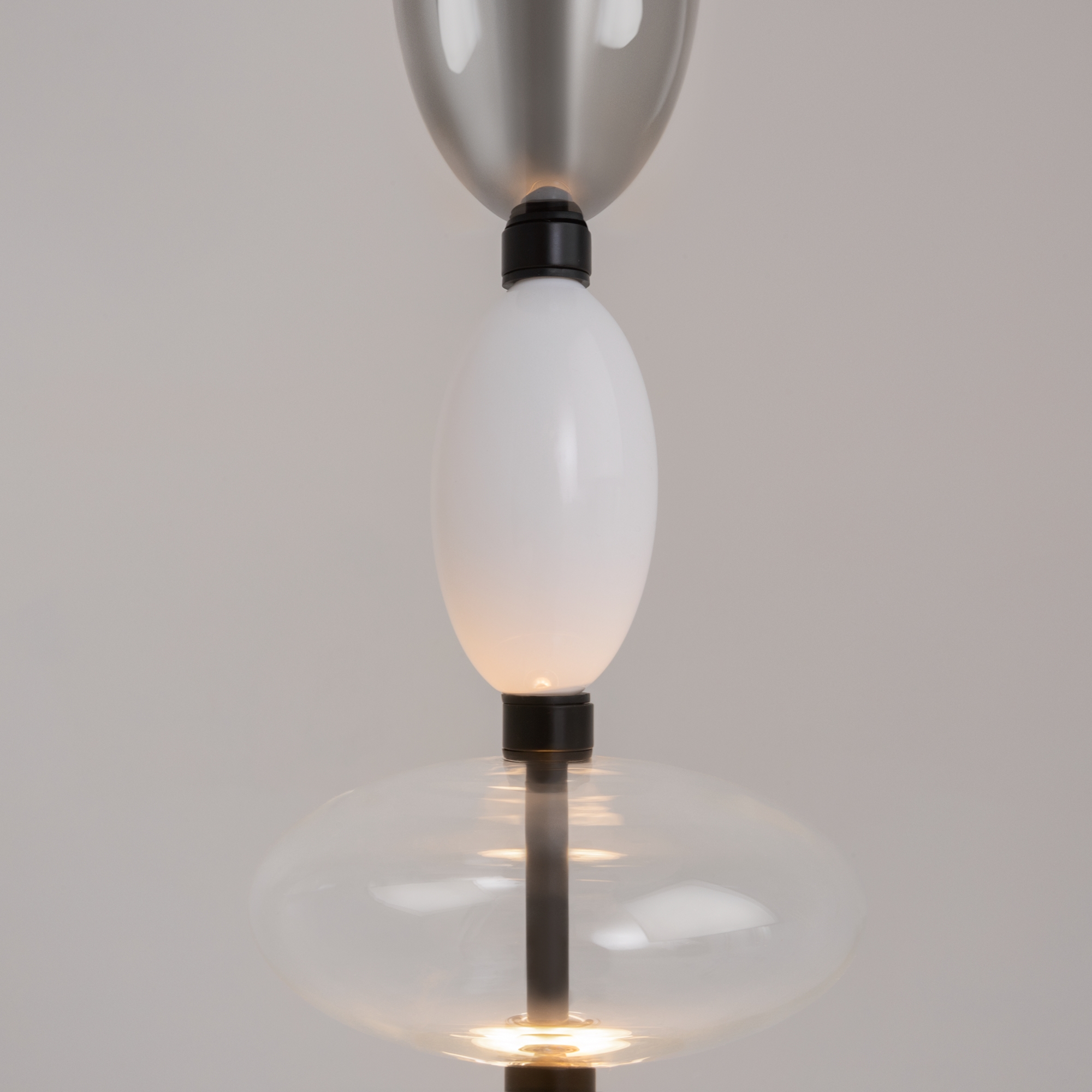 Черная металлическая арматура. Плафоны из стекла коньячного, белого, дымчатого цвета и прозрачный. Источник света комбинированный: нижний — съемная лампа с цоколем GU10, верхний — встроенный LED. Цветовая температура светильников 2700К, угол рассеивания света 120 градусов. Высота регулируется с помощью провода длиной 3 м. Монохромный дизайн, стеклянные элементы впишутся в различные стили интерьеров.