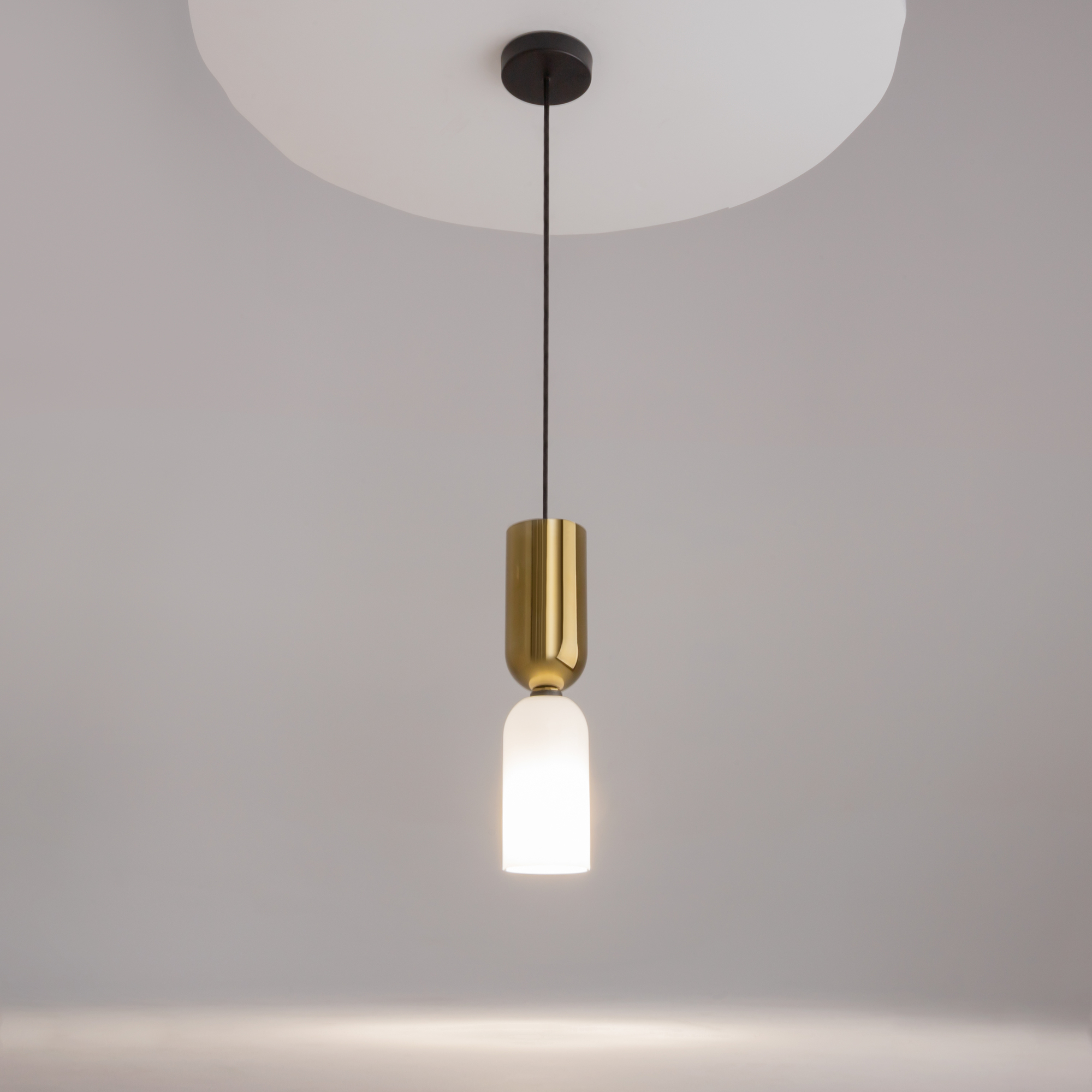 Металлическая арматура, цвет — черный. Светильники стилизованы под форму песочных часов с обтекаемой формой. Керамические элементы с глянцеовй глазурью. Подвесные светильники с плафонами из белой керамики с прозрачным, черно-белым, золото-белым и белым стеклом. Регулируемая высота подвесных светильников.