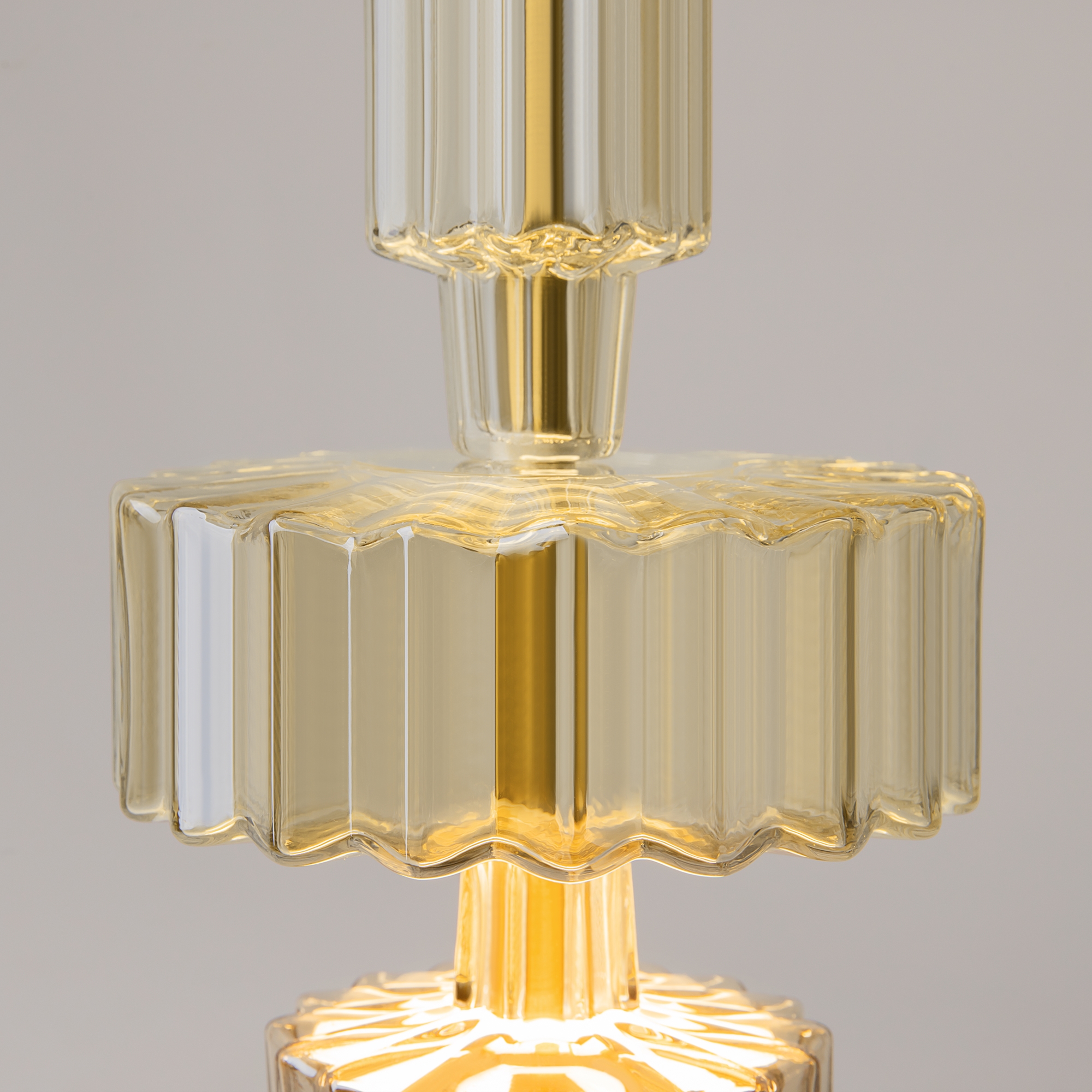 Арматура в цвете латуни. Плафоны и декоративные элементы стеклянные, цвет коньячный. Источник света: LED-светодиод. Цветовая температура — 3000К, угол рассеивания — 120 градусов. Регулируемый по длине провод 3 метра — для использования в помещениях с высокими потолками. 3 варианта дизайна плафонов для составления композиций из одинарных светильников. Магнитные потолочные чаши без креплений сбоку и держателя провода.