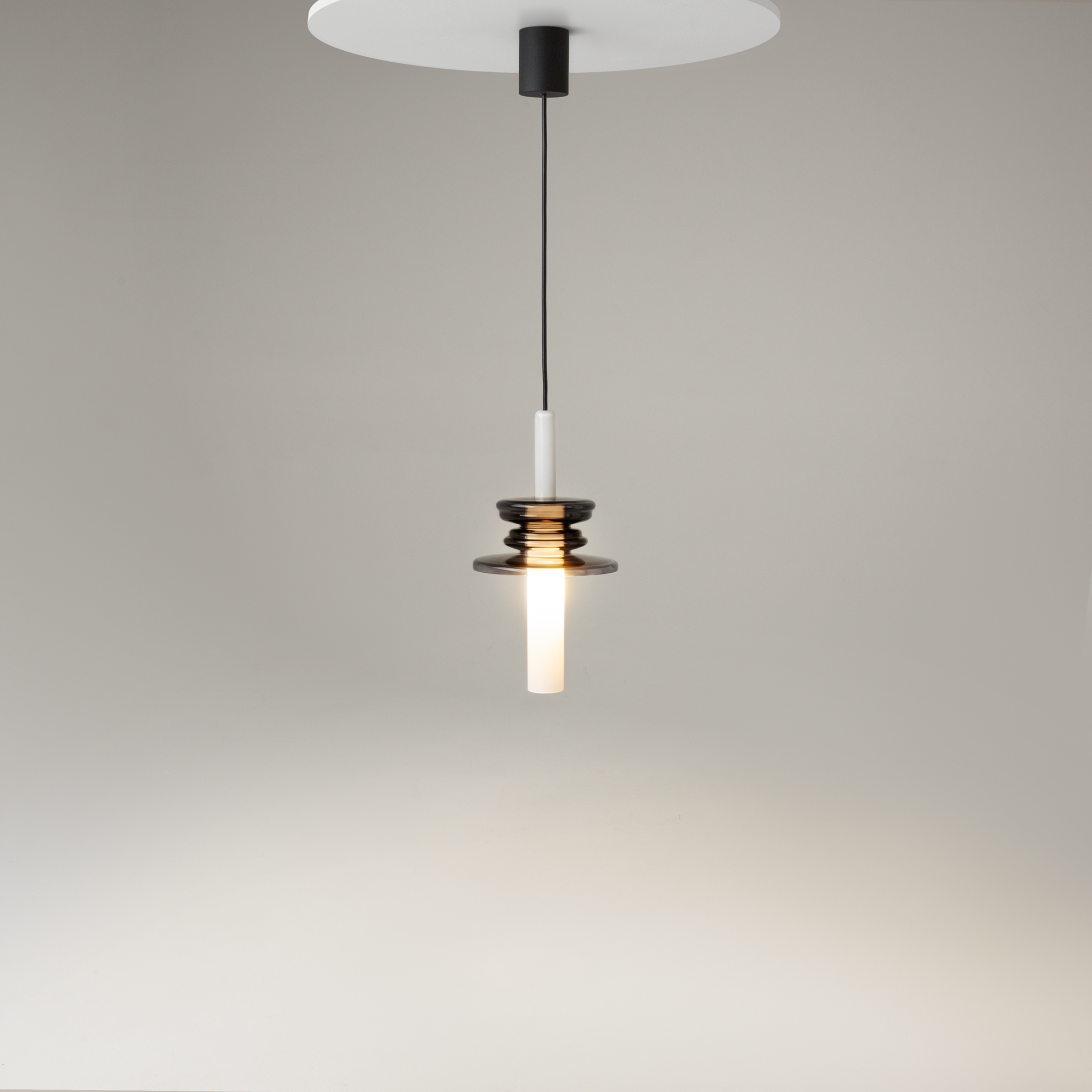 Уникальная многослойная конструкция в образе звуковой волны. Магнитная потололчная чаша из металла без видимых креплений. Плафон-трубка из белого полупрозрачного стекла. Декоративный волнообразный «звуковой» элемент из литого стекла в центре плафона. Цвета — синий, черный, золото, серый. Источник света — лампа с цоколем G9.