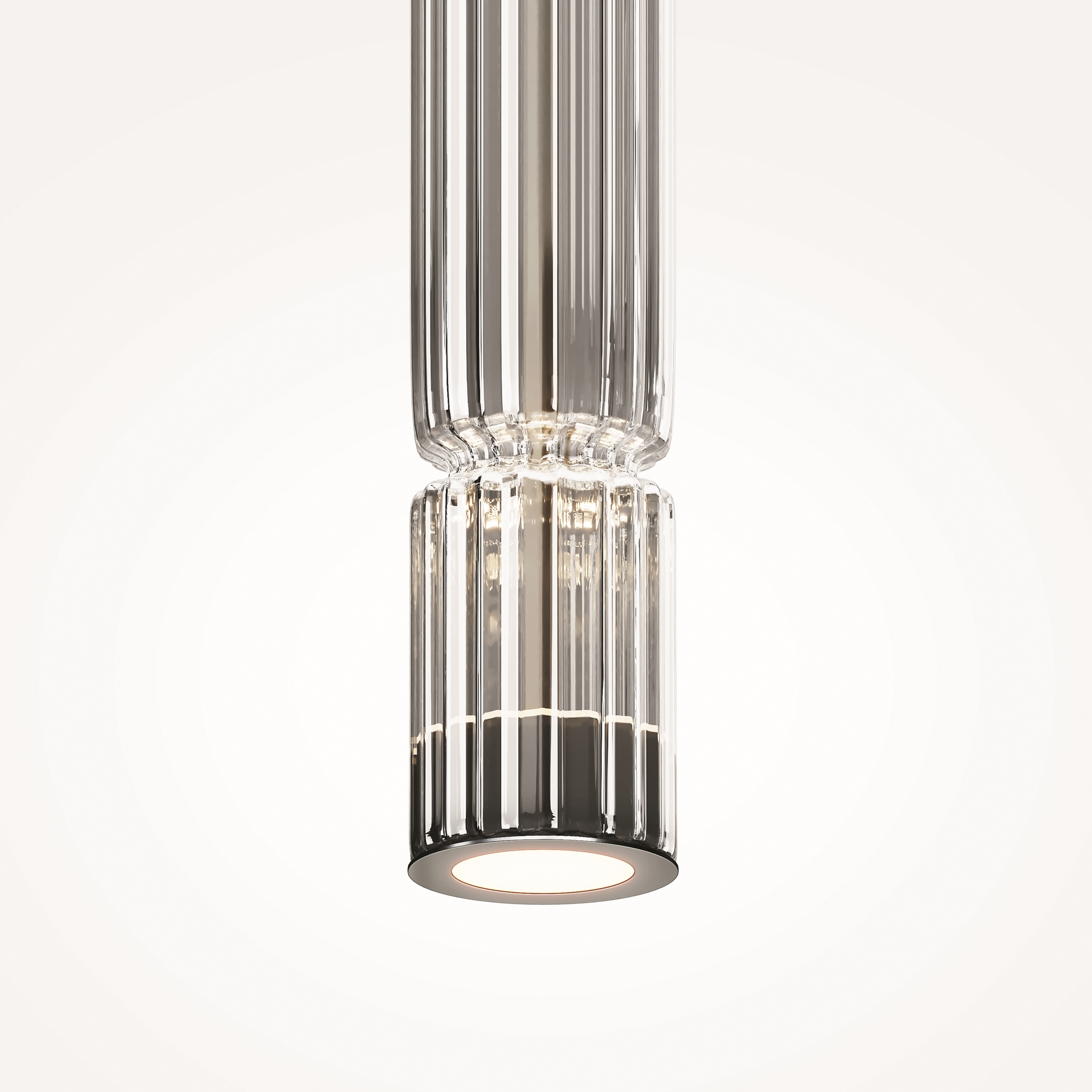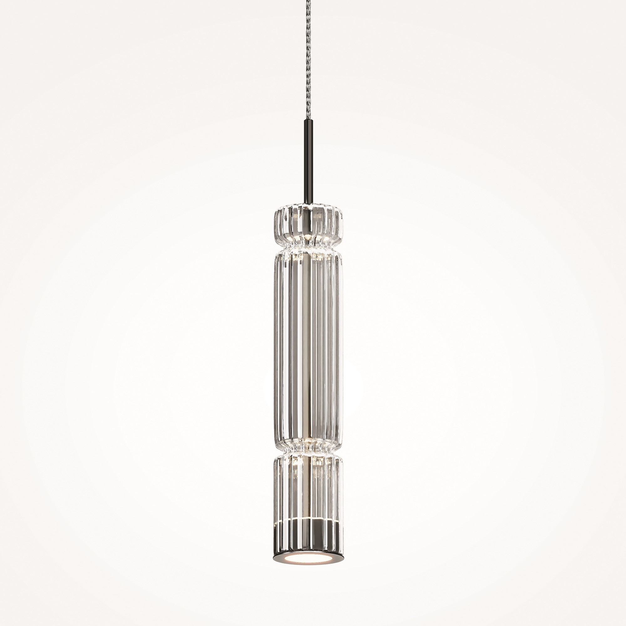 Арматура — металл, цвет — хром, черный. Цилиндрические плафоны из стекла с вертикальным рельефным рисунком в трех оттенках: прозрачный, коньячный, дымчатый. Метафора древнегреческих храмовых колонн в образе светильников. LED-источник света. Цветовая температура 3000К.
