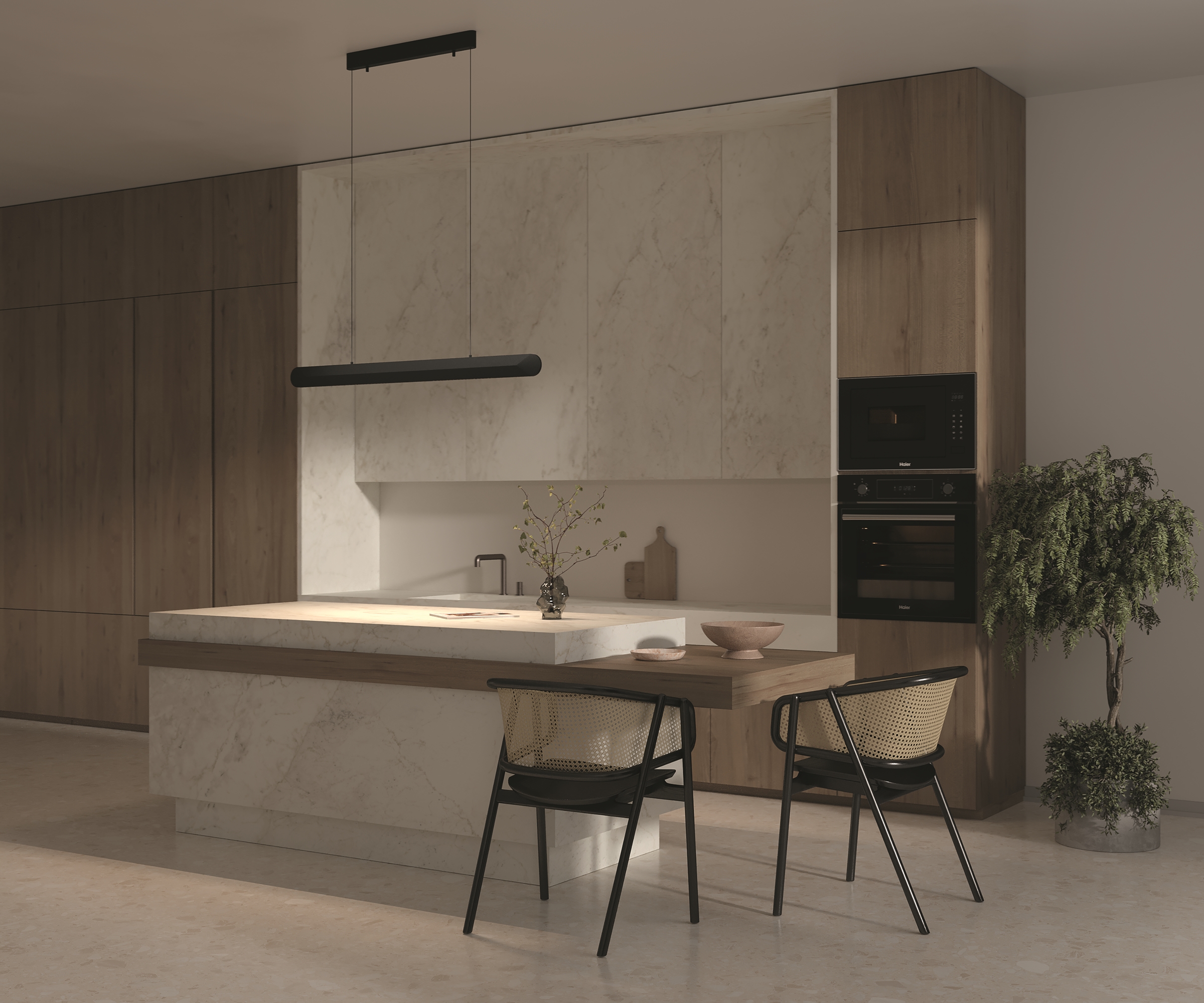 Материал арматуры — алюминий, цвета — черный, белый. LED-источник света, цветовая температура: 3000K. Минималистичный дизайн с управлением при помощи сенсора движения. Функции: включение, выключение и диммирование легким движением руки под горизонтальным светильником и бра. Регулируемый провод 3 метра, подходит для помещений с высокими потолками.