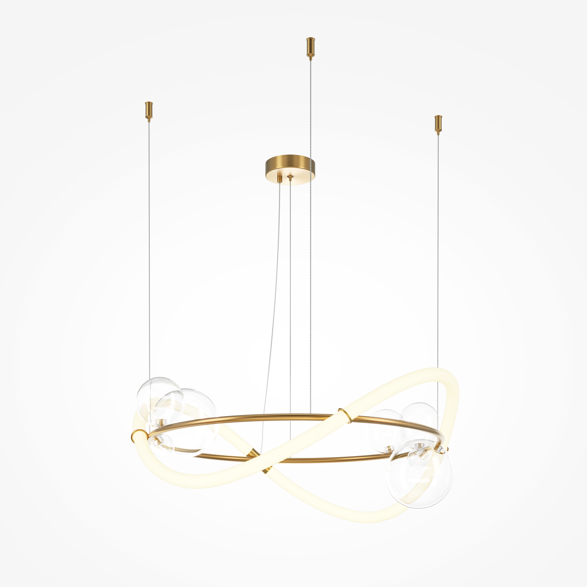 Арматура из металла цвета латуни, материал рассеивателя – текстильный жгут, декоративные элементы выполнены из прозрачного выдувного стекла. LED-источник света. Цветовая температура 3000К, угол рассеивания света 360°. Вертикальное настенное бра включается touch-сенсором. Тканевый шнур. Высота подвесных светильников регулируется.