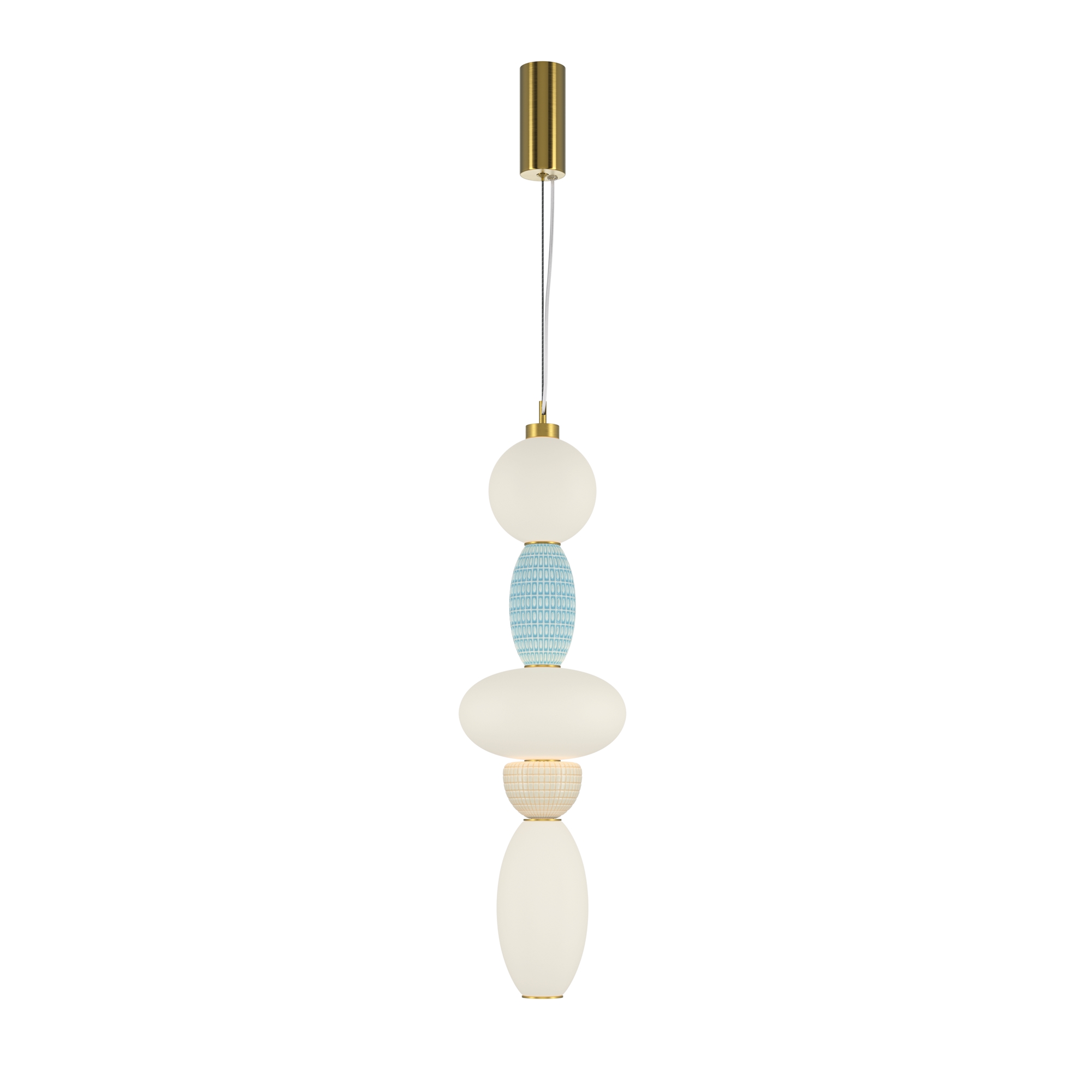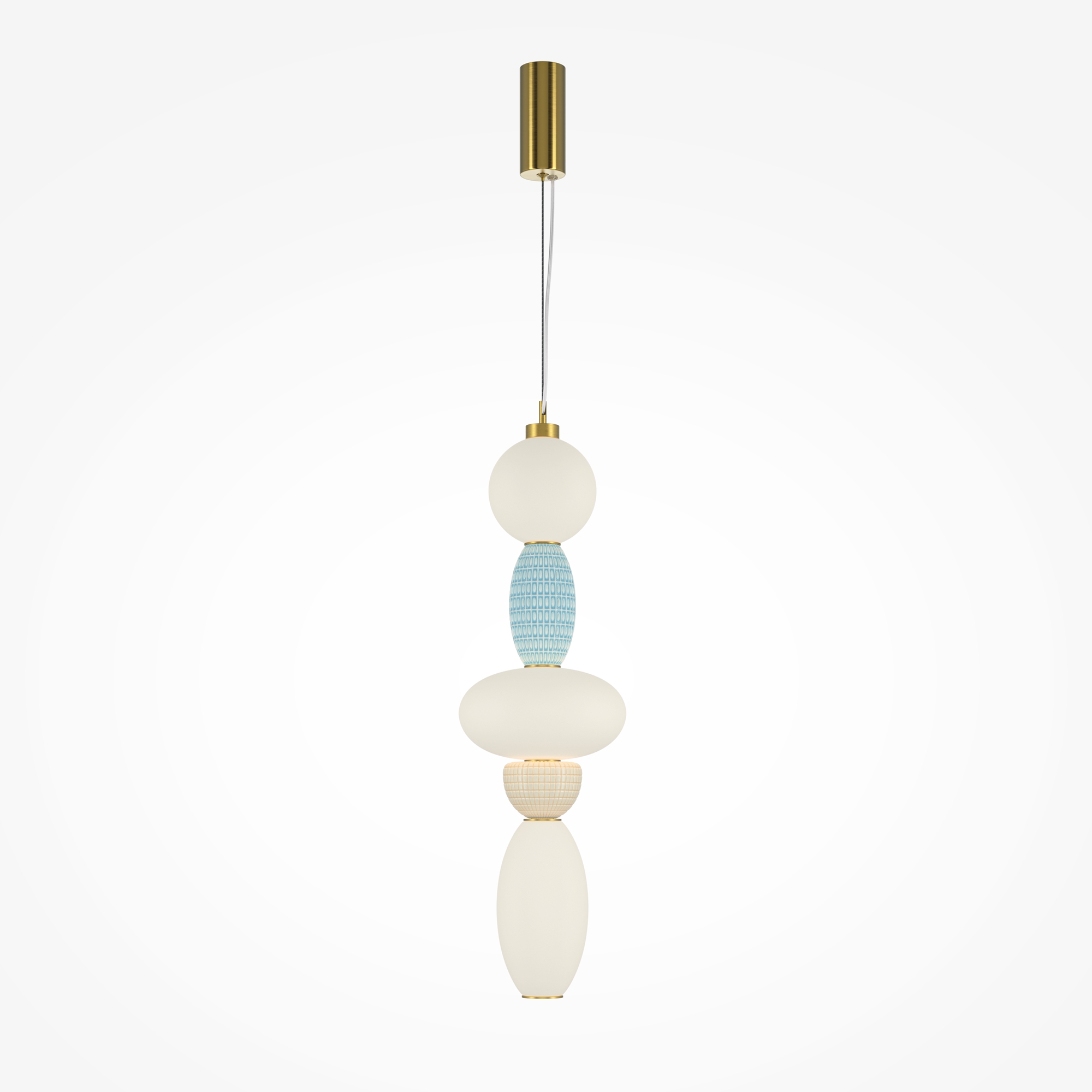 Металлическая арматура цвета латуни. Плафоны из белого стекла для мягкого, равномерного освещения, декоративные элементы из цветной керамики. Угол рассеивания 120°. Цветовая температура – 3000 К. Регулируемый провод длиной 3 м.