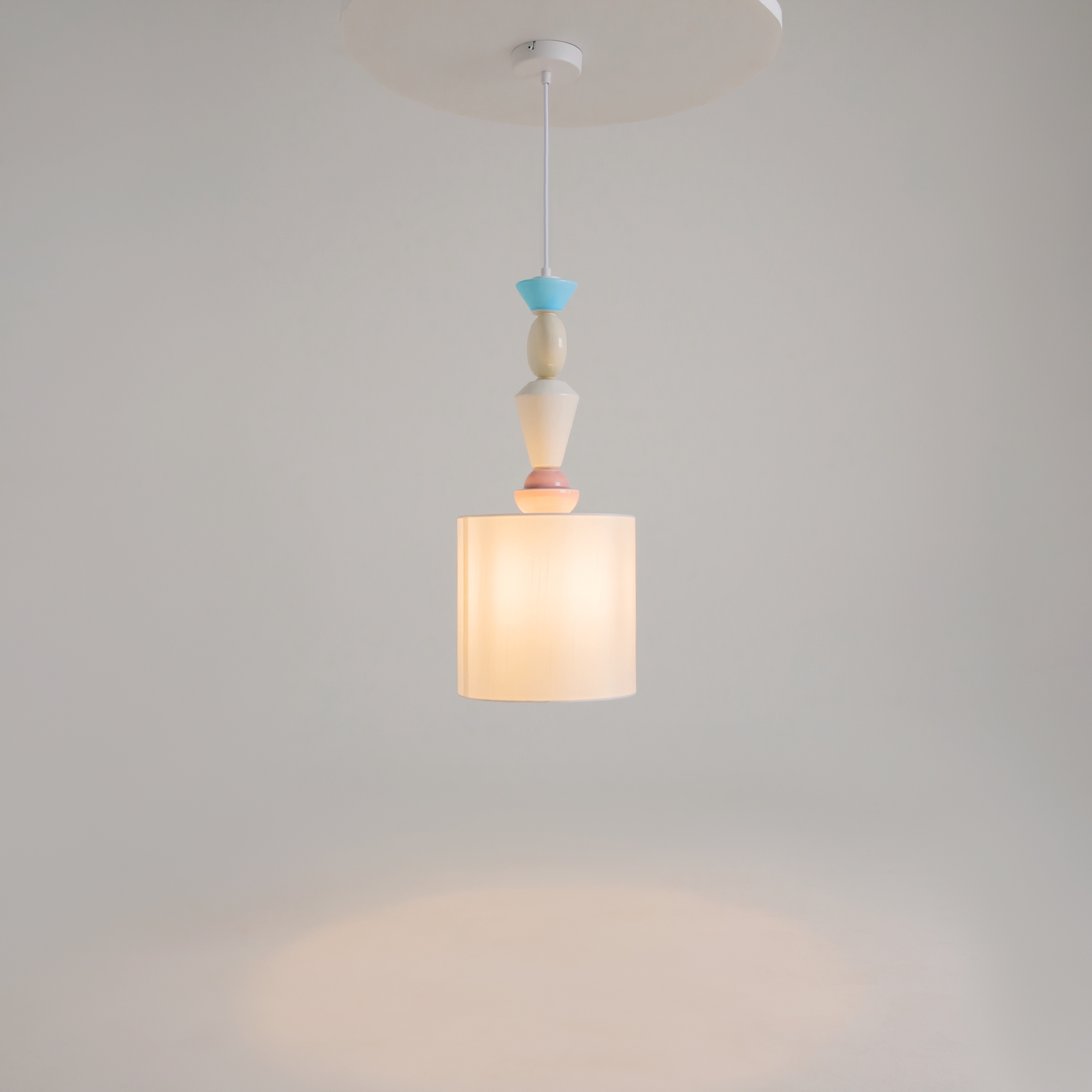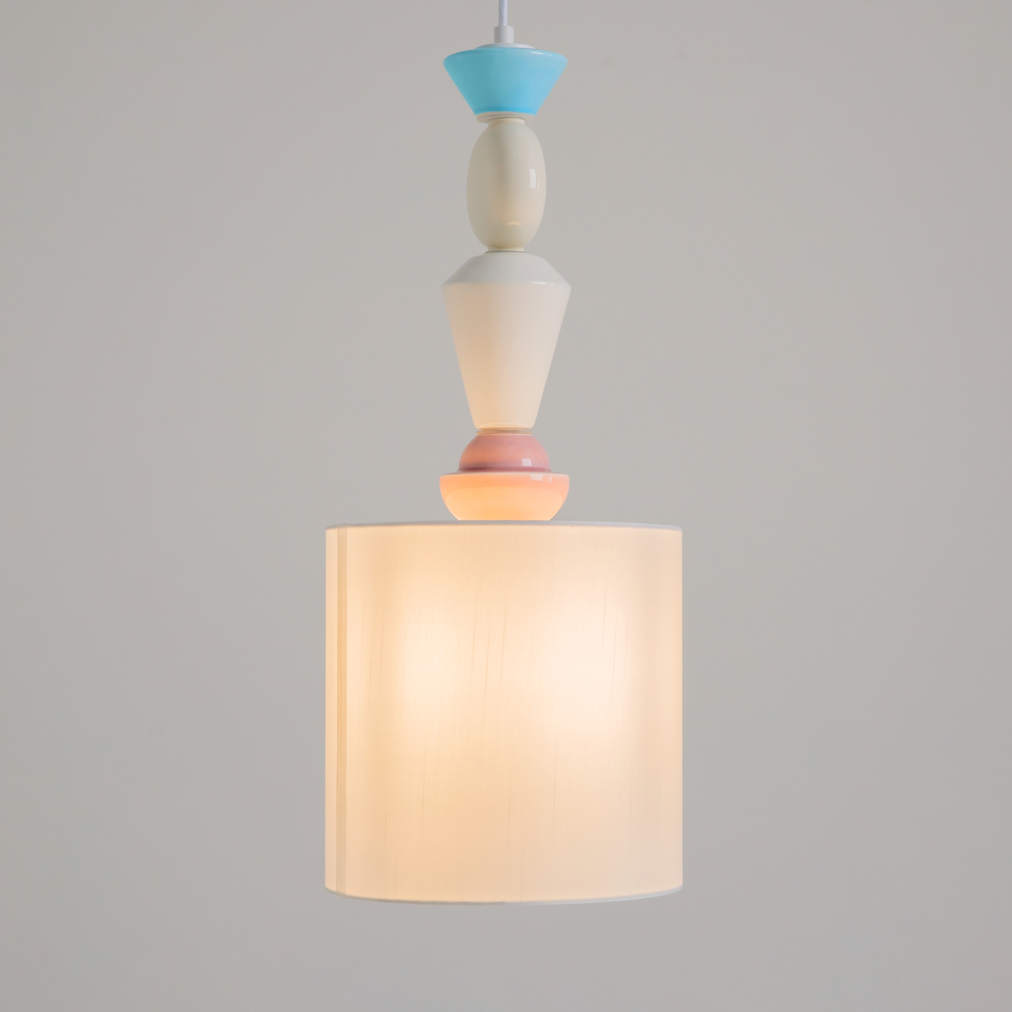 Арматура из металла, цвет — белый. Абажур выполнен из натуральной ткани, цветные декоративные элементы в пастельных тонах — из керамики. Белый абажур имеет классическую цилиндрическую форму, ткань дает мягкий рассеянный свет. Светильники комплектуются сменными лампами с цоколем Е27 (не входят в комплект). Провод подвесного светильника можно регулировать по длине. Декор напоминает стилистику крафтового искусства