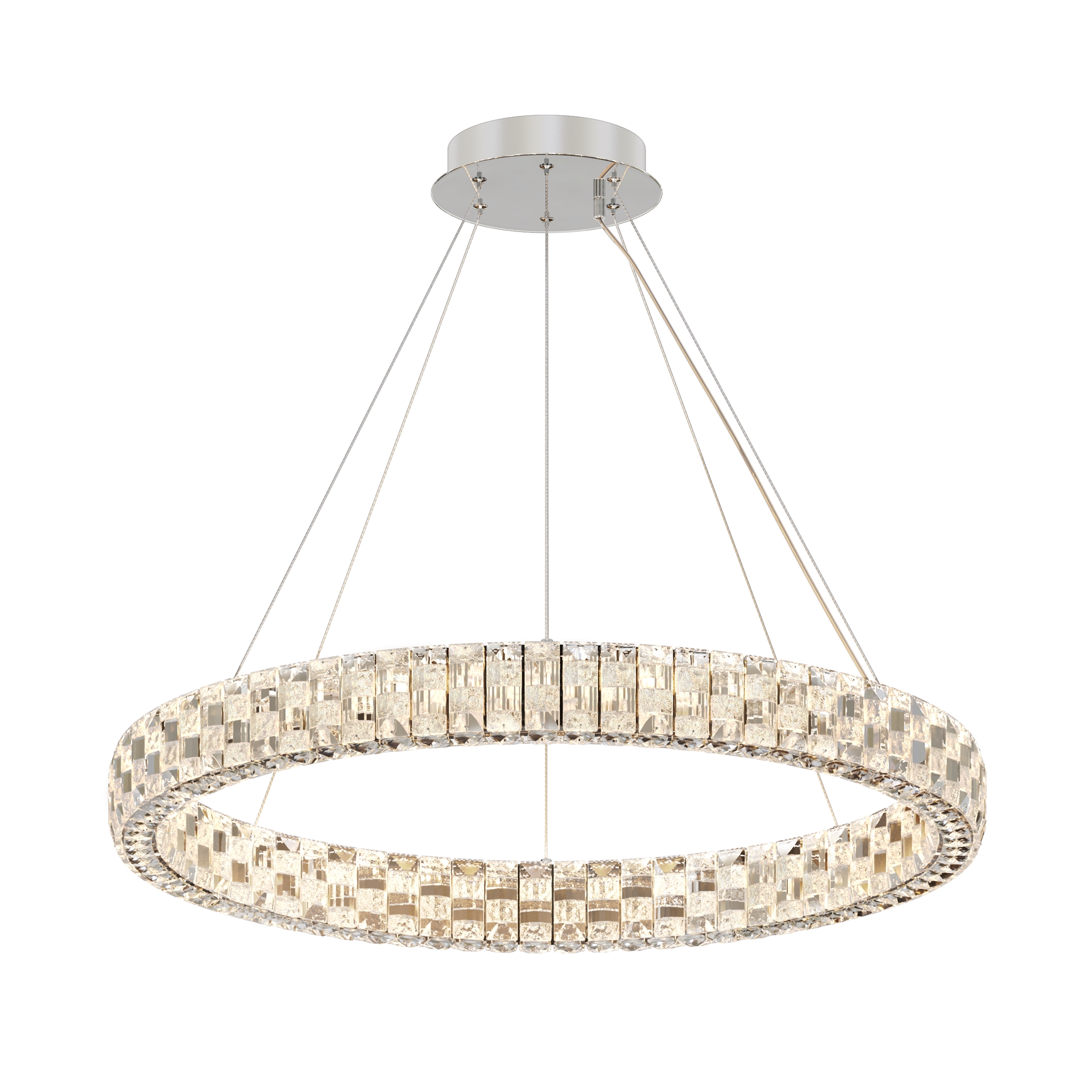 Металлическая арматура в двух вариантах цвета — хром или золото. Прозрачные декоративные элементы из хрустального стекла. Широкое кольцо снабжено LED-источником света. Цветовая температура потока излучения — 3000 К, угол рассеивания — 120 градусов. Регулируемый по высоте провод длиной 3 метра. Украшение шахматным рисунком.