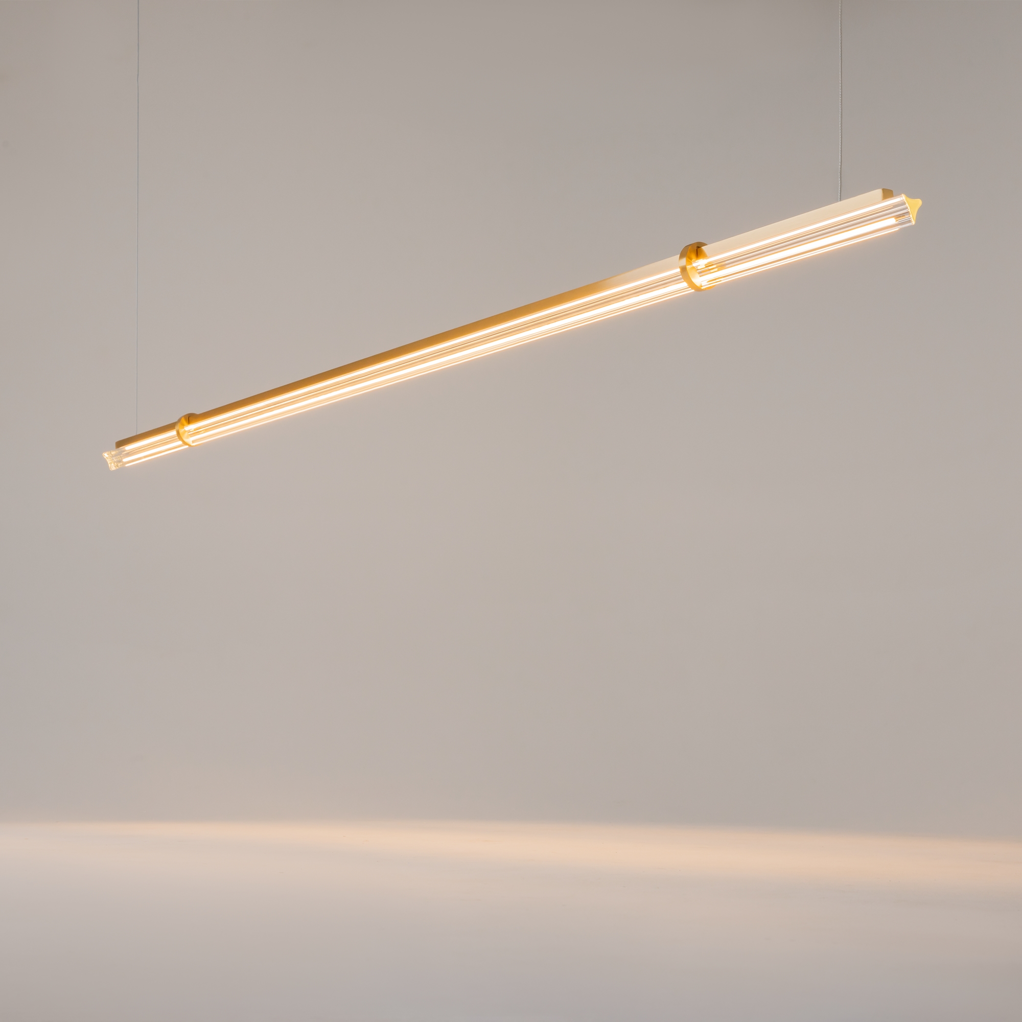 Металлическая арматура латунного цвета дополнена сатинированным финишным покрытием. Тонкие плафоны, изготовленные из рифленого стекла. Два варианта длины: 1200 и 1500 мм. Трехметровый провод можно регулировать для установки в помещениях с высокими потолками. Цветовая температура LED-источника света — 3000К, угол рассеивания — 120 градусов.