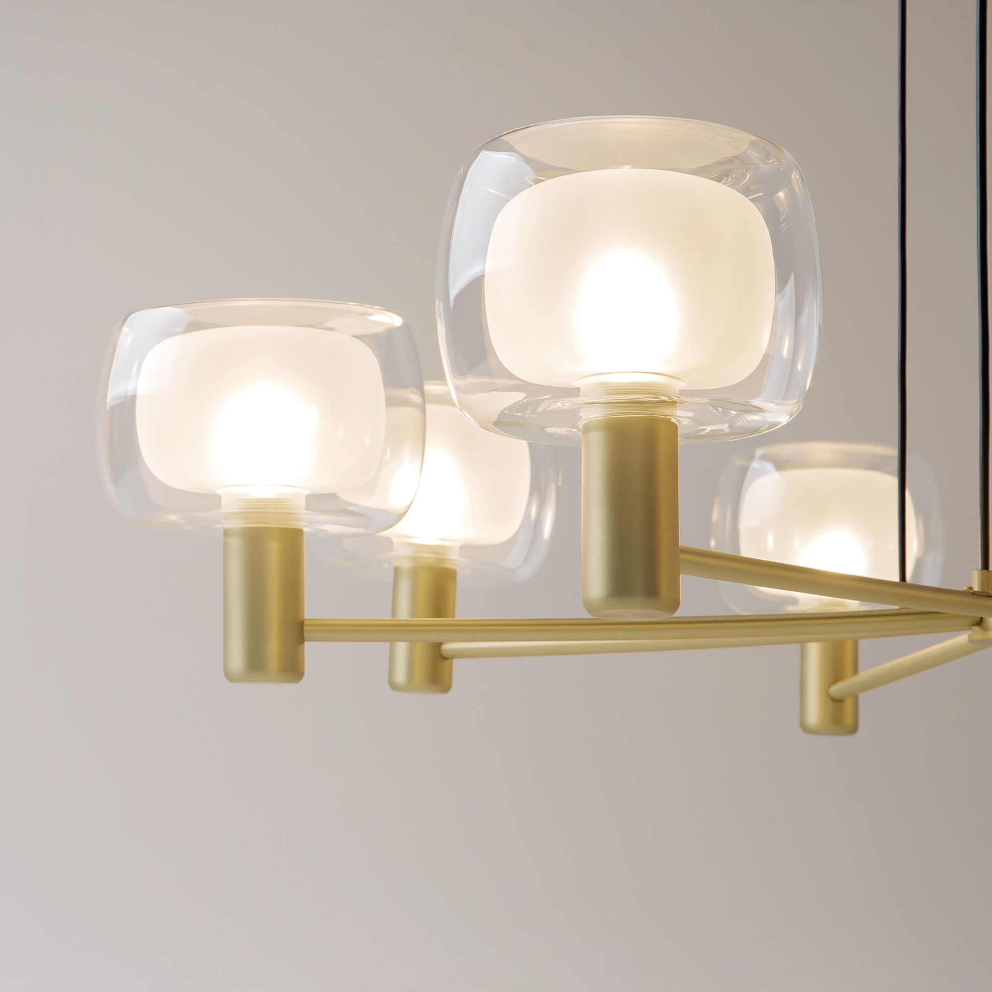 Арматура – алюминий, цвет – золото. Двойной стеклянный плафон: внутренний – матовый, внешний – прозрачный. Стиль – итальянская неоклассика. Культовые формы 60-х в дизайне.