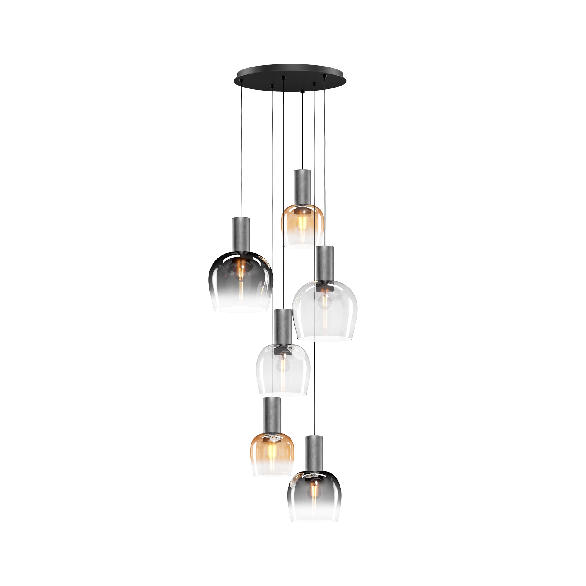 Цветовая гамма: дымчато-серый или насыщенно-янтарный цвет стекла в сочетании с черной или золотой арматурой. В серии есть модели светильников со сменным источником света с цоколем Е27 (каскадная композиция, потолочный и настольные светильники) и LED-источником (одинарные подвесные светильники). Температура свечения LED – 3000 К, угол рассеивания — 120 градусов. Плафоны каскадной композиции плафоны разных размеров и оттенков, установленные на одно основание. Оригинальный декор — актуальный вариант современной классики.