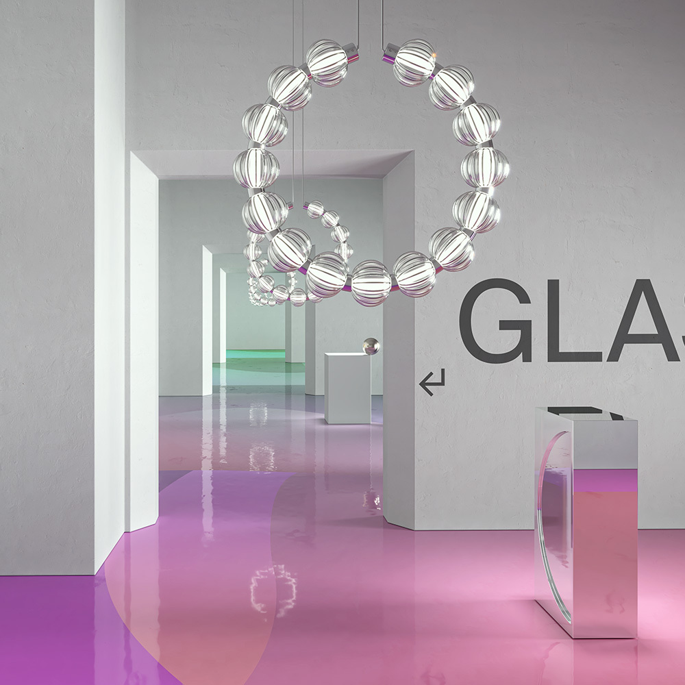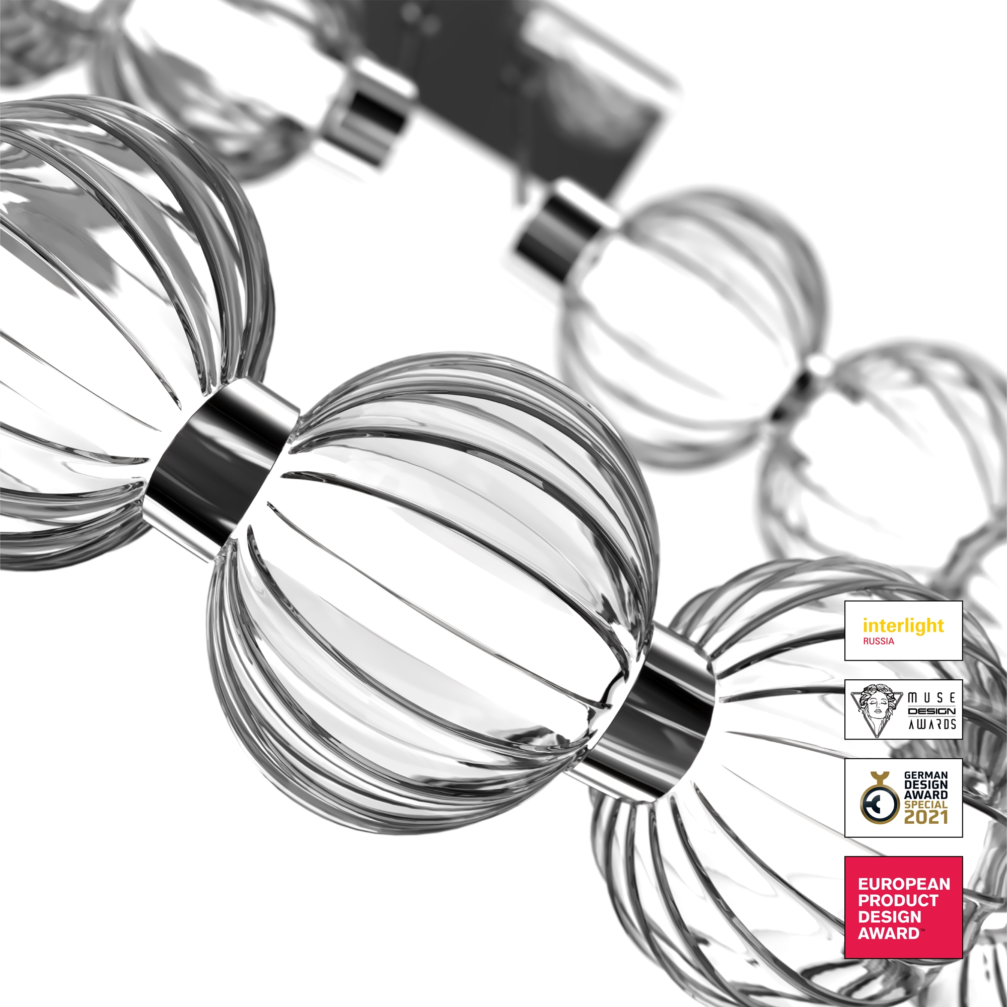 Арматура из металла, цвет – хром. Акцентный декор в виде рельефных сфер из литого стекла. Источник света – светодиодная лента – скрыта под акриловым рассеивателем. Регулируемая высота подвесных светильников.