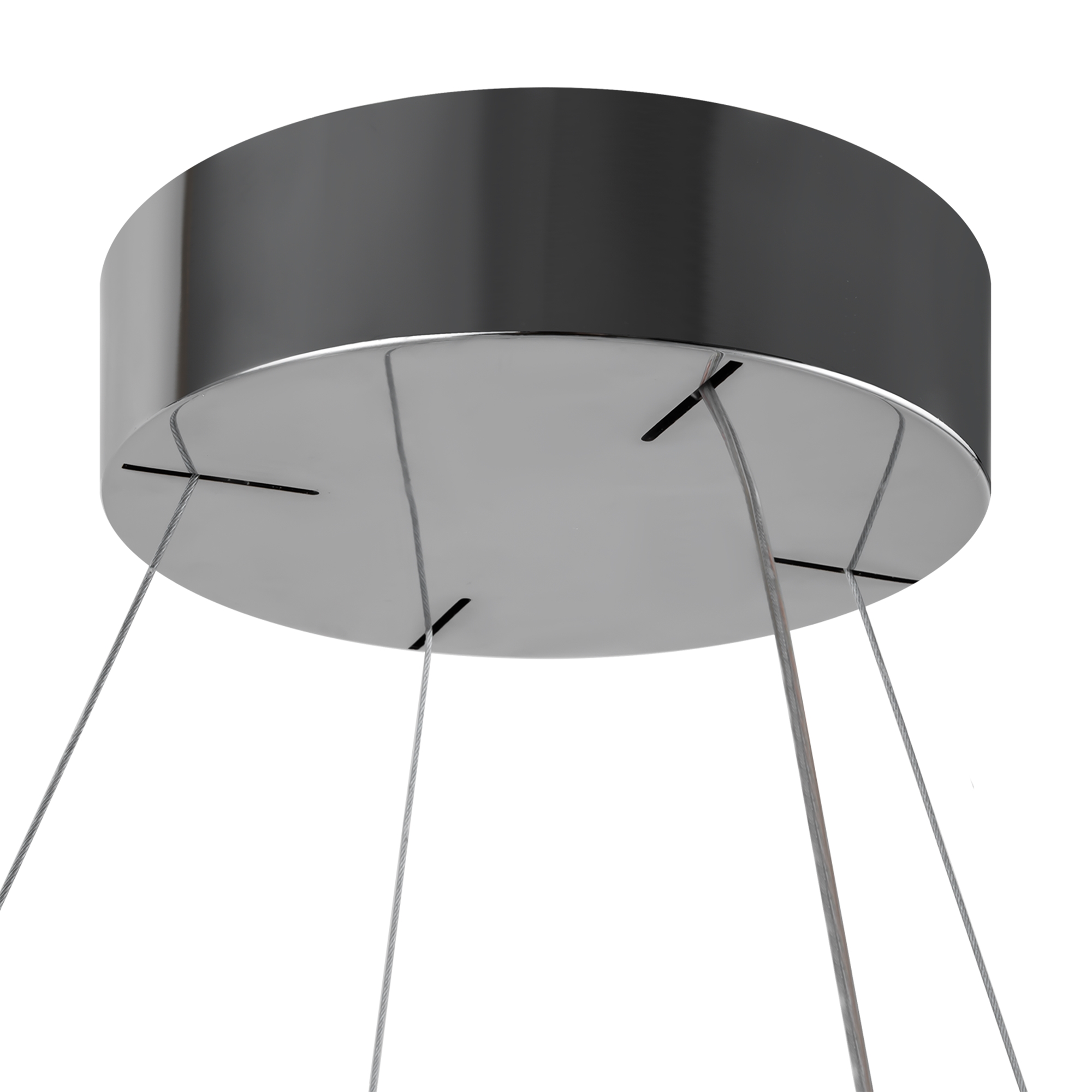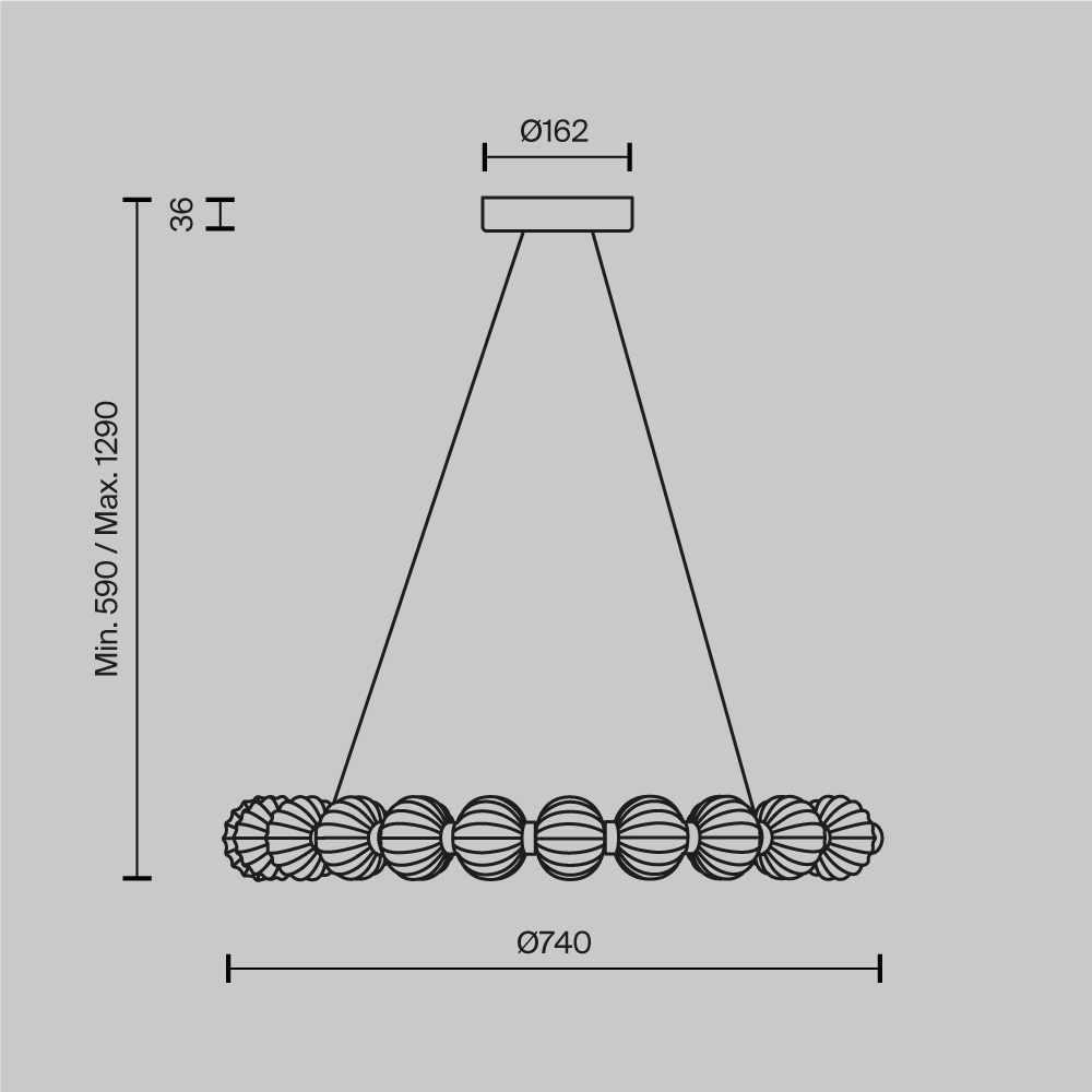 Арматура из металла, цвет – хром. Акцентный декор в виде рельефных сфер из литого стекла. Источник света – светодиодная лента – скрыта под акриловым рассеивателем. Регулируемая высота подвесных светильников.