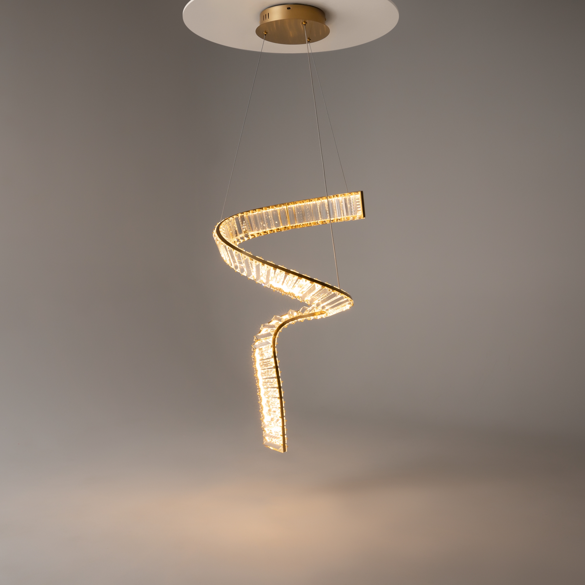 Металлическая арматура в золотом цвете. Асимметричный хрустальный декор. Трендовая форма окружности. LED-источник света с температурой 4000К. Высокий индекс цветопередачи 90Ra.