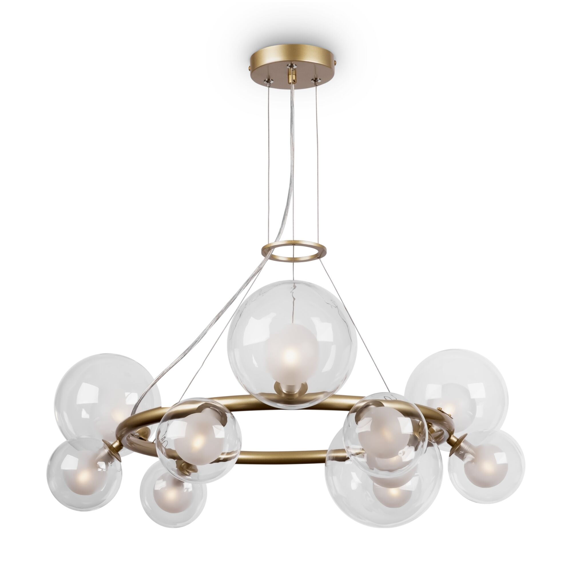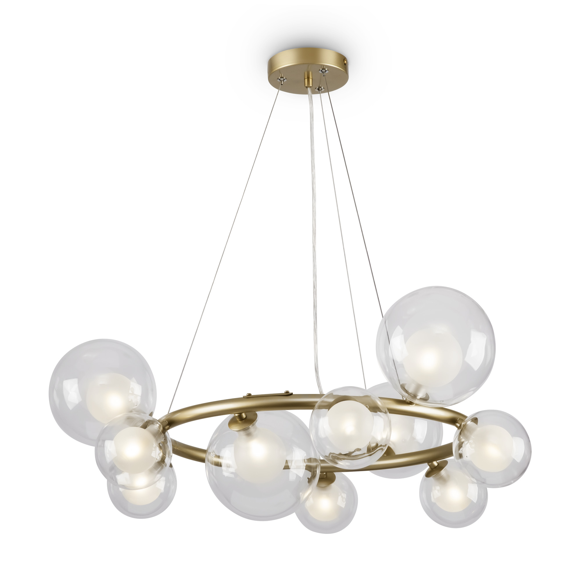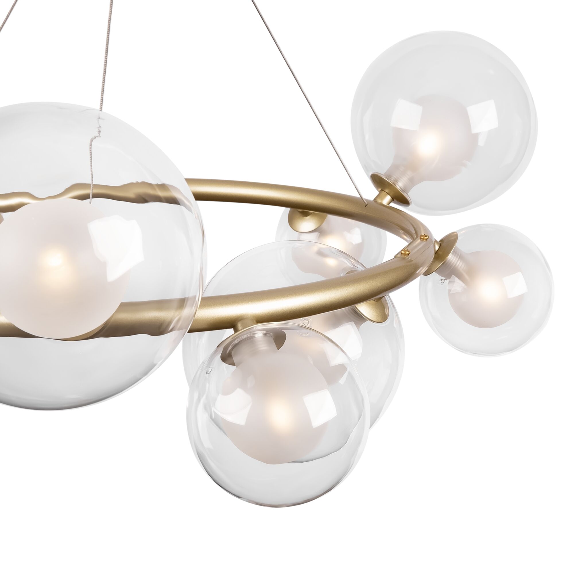 Металлическая арматура оттенка матового золота. Двойные стеклянные плафоны: матовые внутри и прозрачные снаружи. Плафоны закреплены на окружности, что обеспечивает равномерное освещение. Источник света – лампа с цоколем G9.