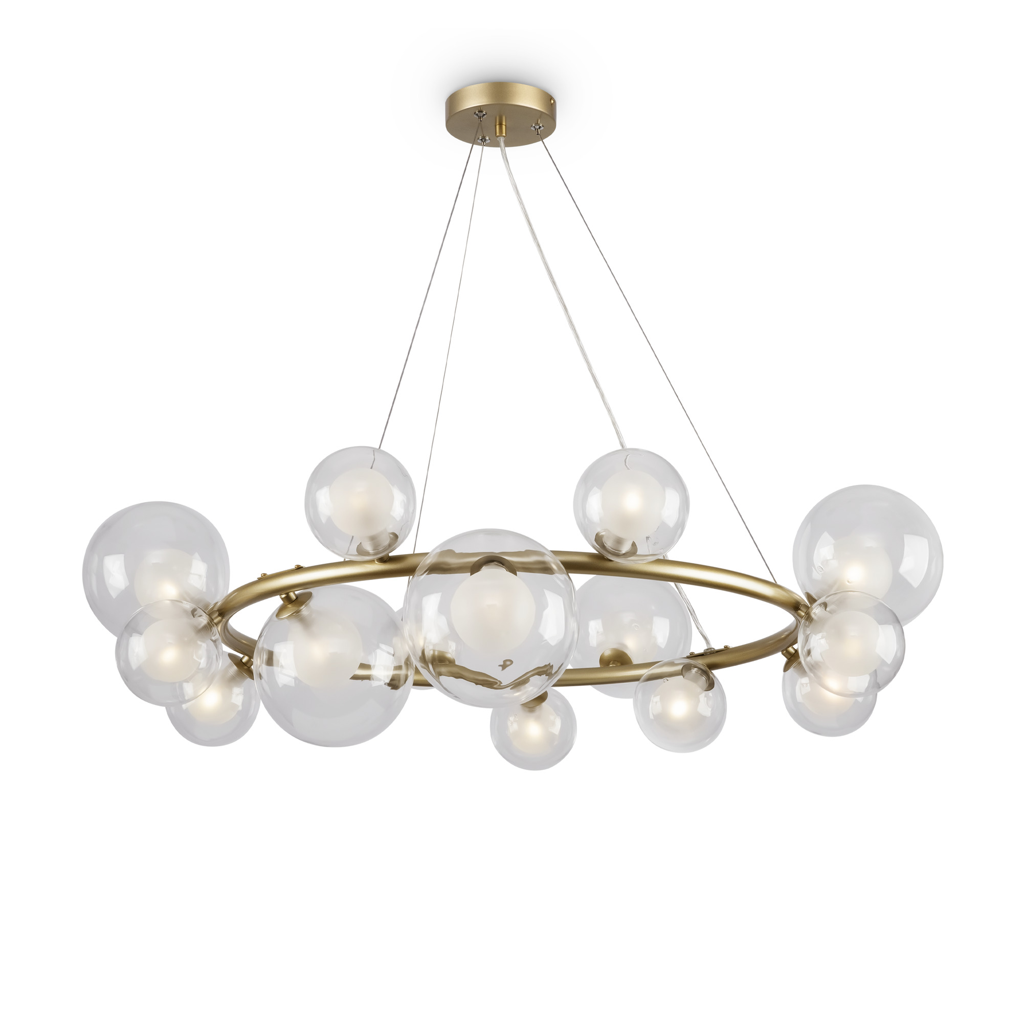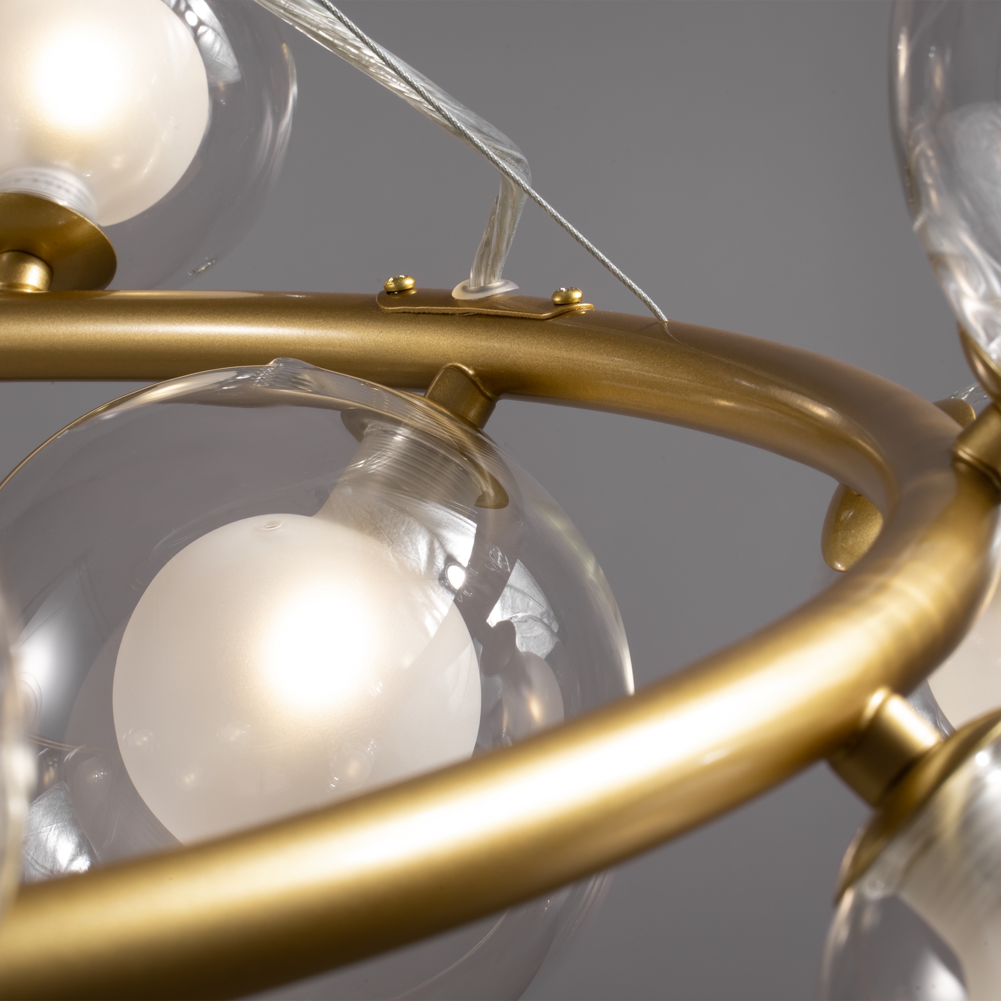 Металлическая арматура оттенка матового золота. Двойные стеклянные плафоны: матовые внутри и прозрачные снаружи. Плафоны закреплены на окружности, что обеспечивает равномерное освещение. Источник света – лампа с цоколем G9.