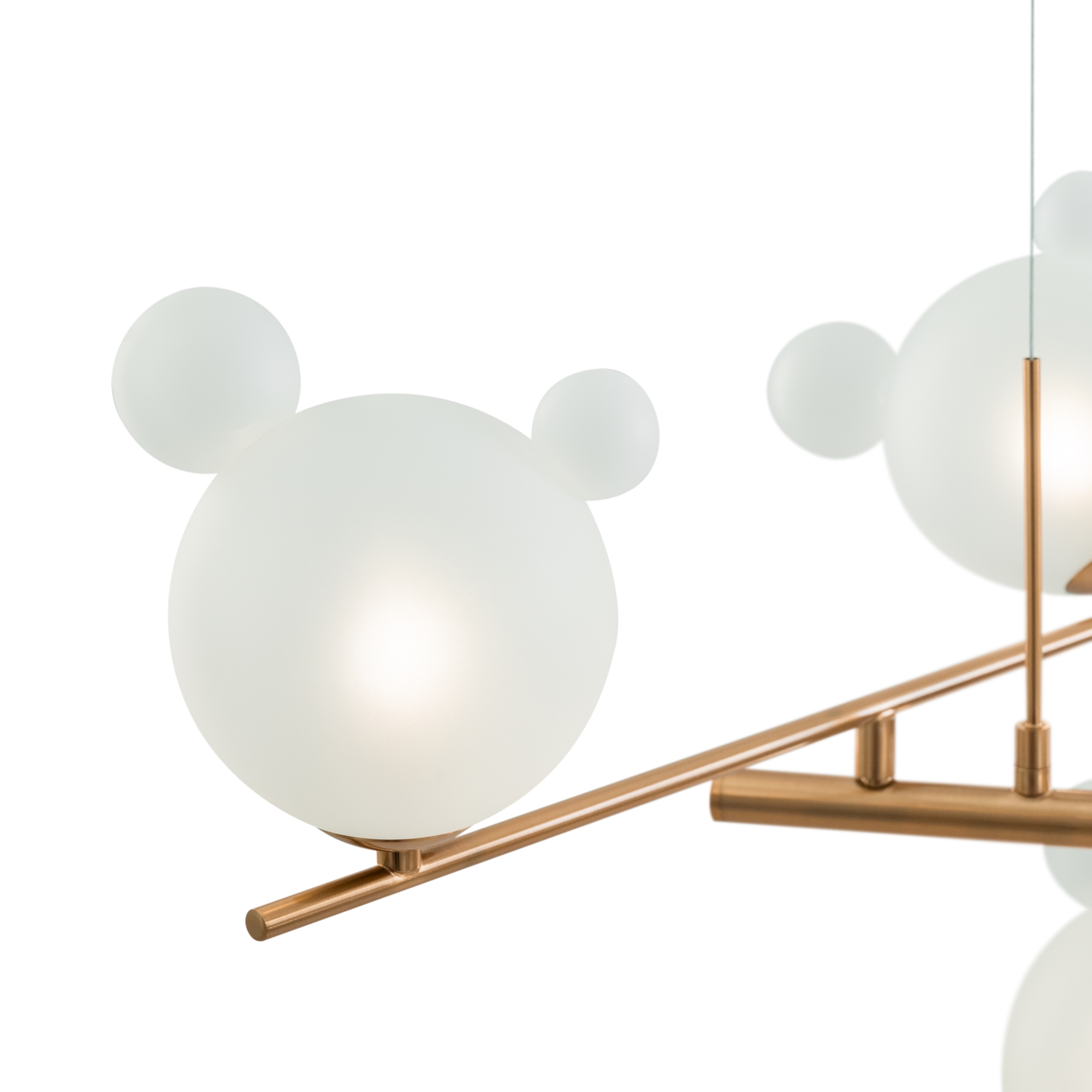 Арматура — металл, цвет— латунь. Белые плафоны из стекла с декоративными “ушками” — напоминают образ знаменитого диснеевского героя. Ассиметричный силуэт создает эффект подвижной игры. Высота подвесных моделей регулируется. Источник света — лампа с цоколем G9