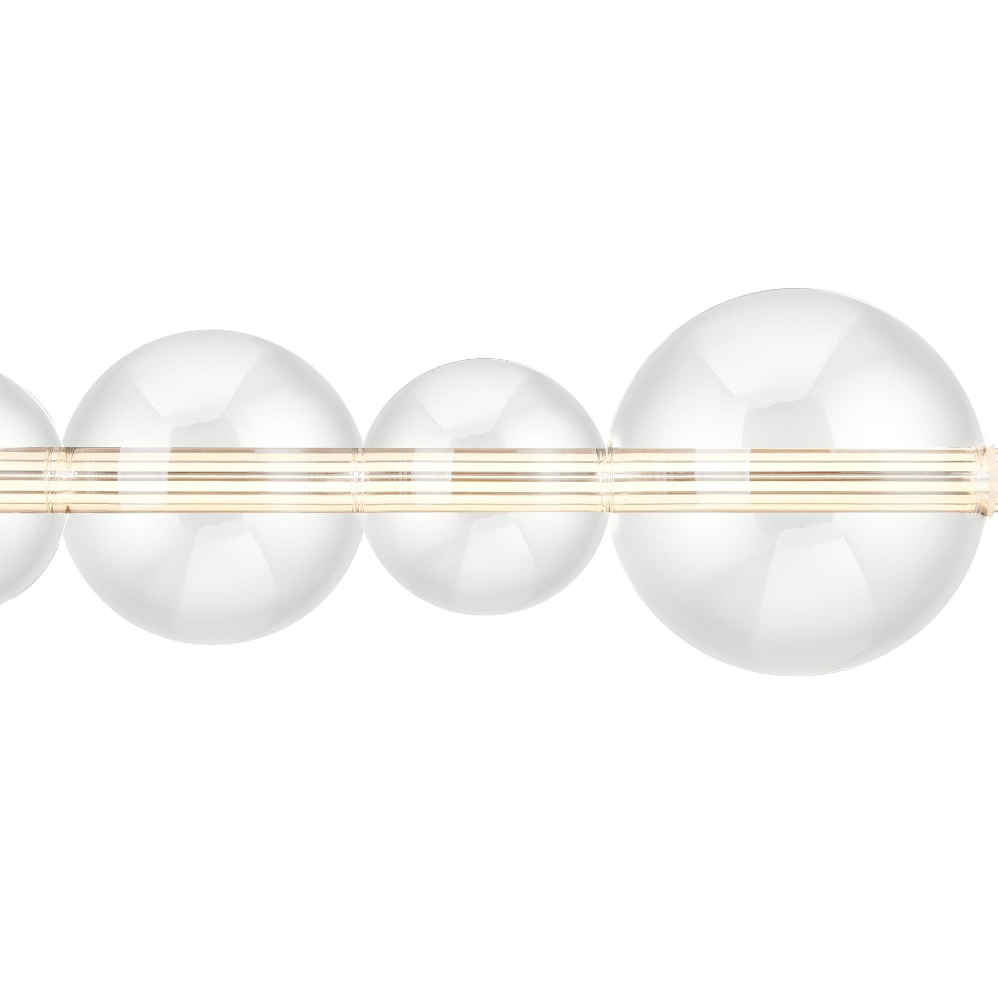 Арматура — металл, цвет — латунь. Тренд «invisible light» — LED-источник света скрыт в горизонтальной стеклянной трубке, пронизывая ряд декоративных плафонов-шаров разного размера из прозрачного стекла. Воздушная минималистичная горизонтальная конструкция. Регулируемая высота. Цветовая температура — 3000К.