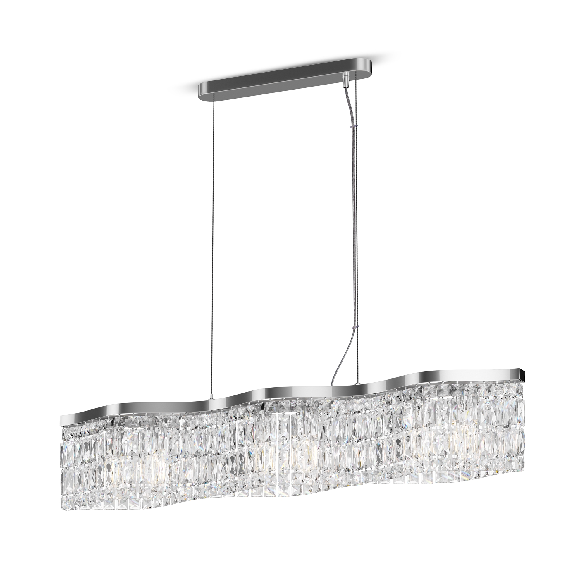 Металлическая арматура в двух оттенках: хром, золото. Декор – прозрачные кристаллы. Потолочные модели имеют два яруса подвесок. Высота подвесной люстры регулируется тросом.