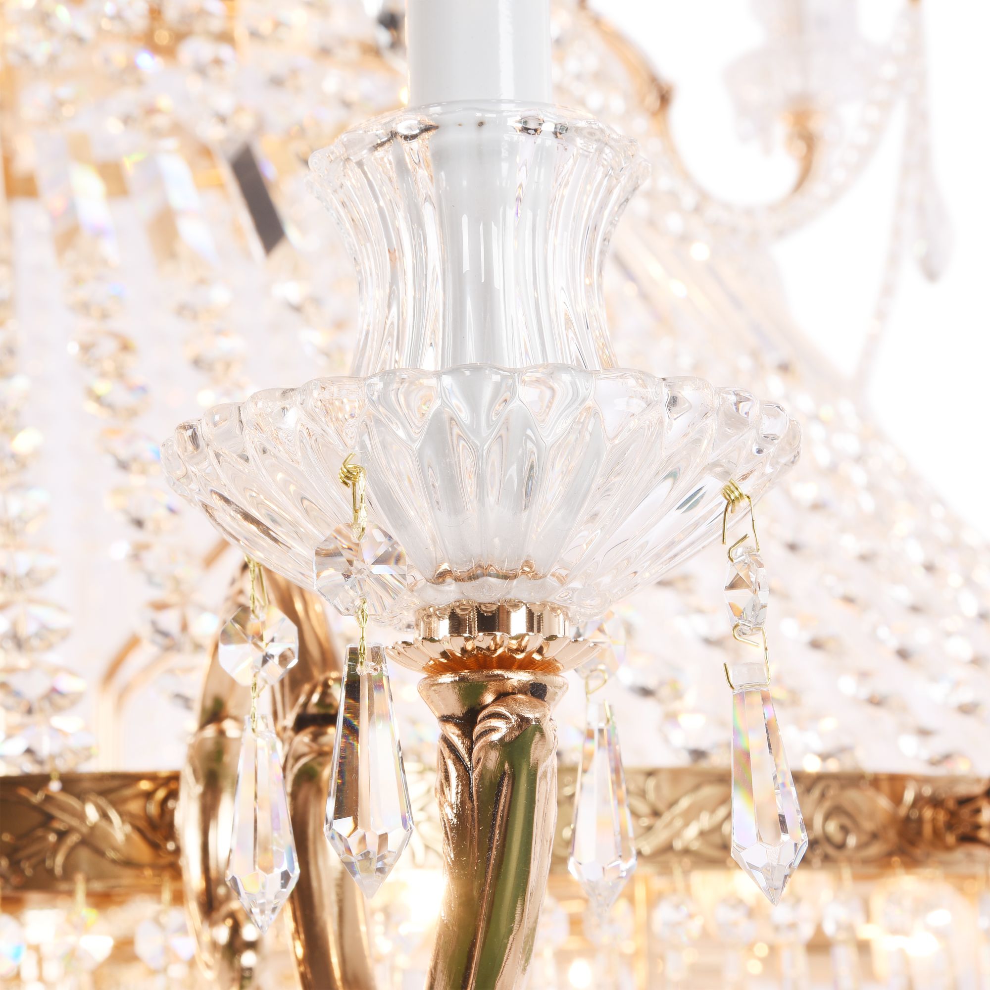 Арматура из металла, цвет – античное золото. Декор металлических элементов – инкрустированный цветочный орнамент. Многоярусные хрустальные подвески скрывают лампы. Часть моделей имеет открытые источники света в виде свечей.
