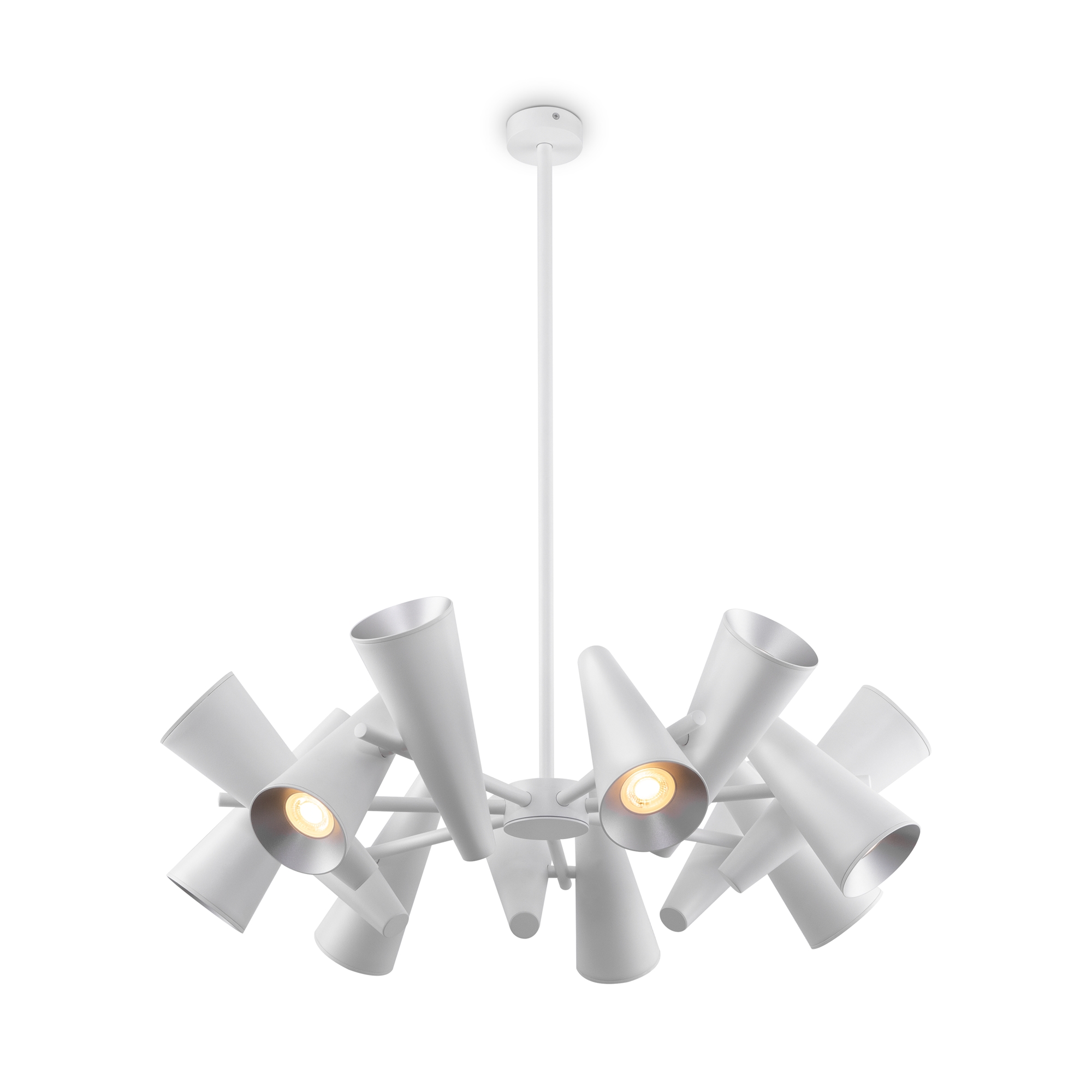 Металлическая арматура в двух оттенках: белый и черный. Плафоны-конусы выполнены из алюминия. Оттенки: белый, латунь. Рожки вращаются, можно менять направление света. Высота регулируется с помощью разборного центрального элемента.