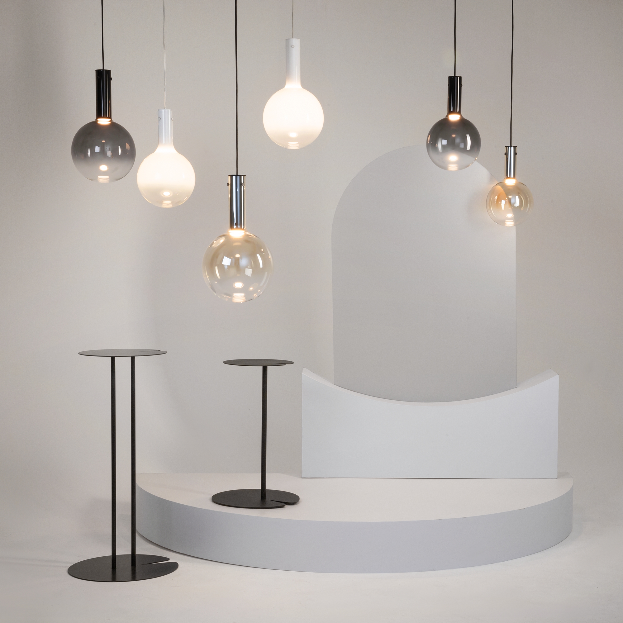 Металлическая арматура, цвет — черный, белый. Выдувной плафон-шар из стекла с вытянутым цилиндрическим основанием в трех цветах: дымчато-черный, туманно-белый, бежево-коньячный. LED-источник света в основании плафона. Цветовая температура 3000К. Два диаметра плафонов и регулируемая длина проводов для создания разнообразных композиций.
