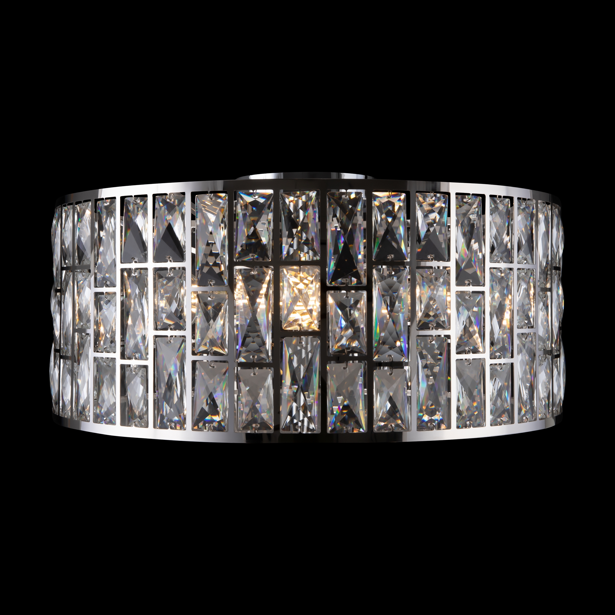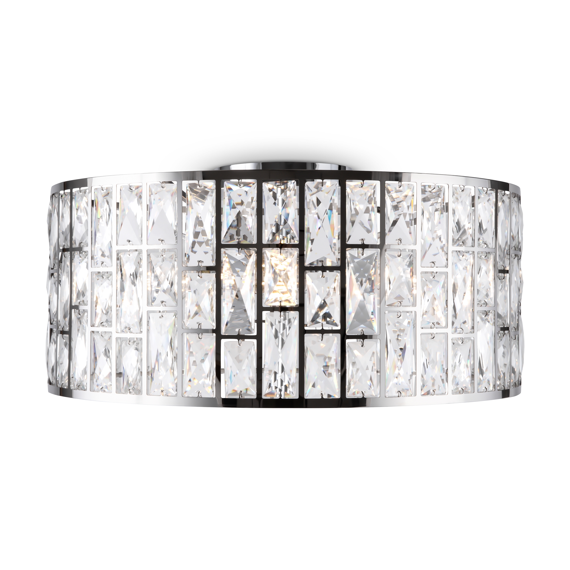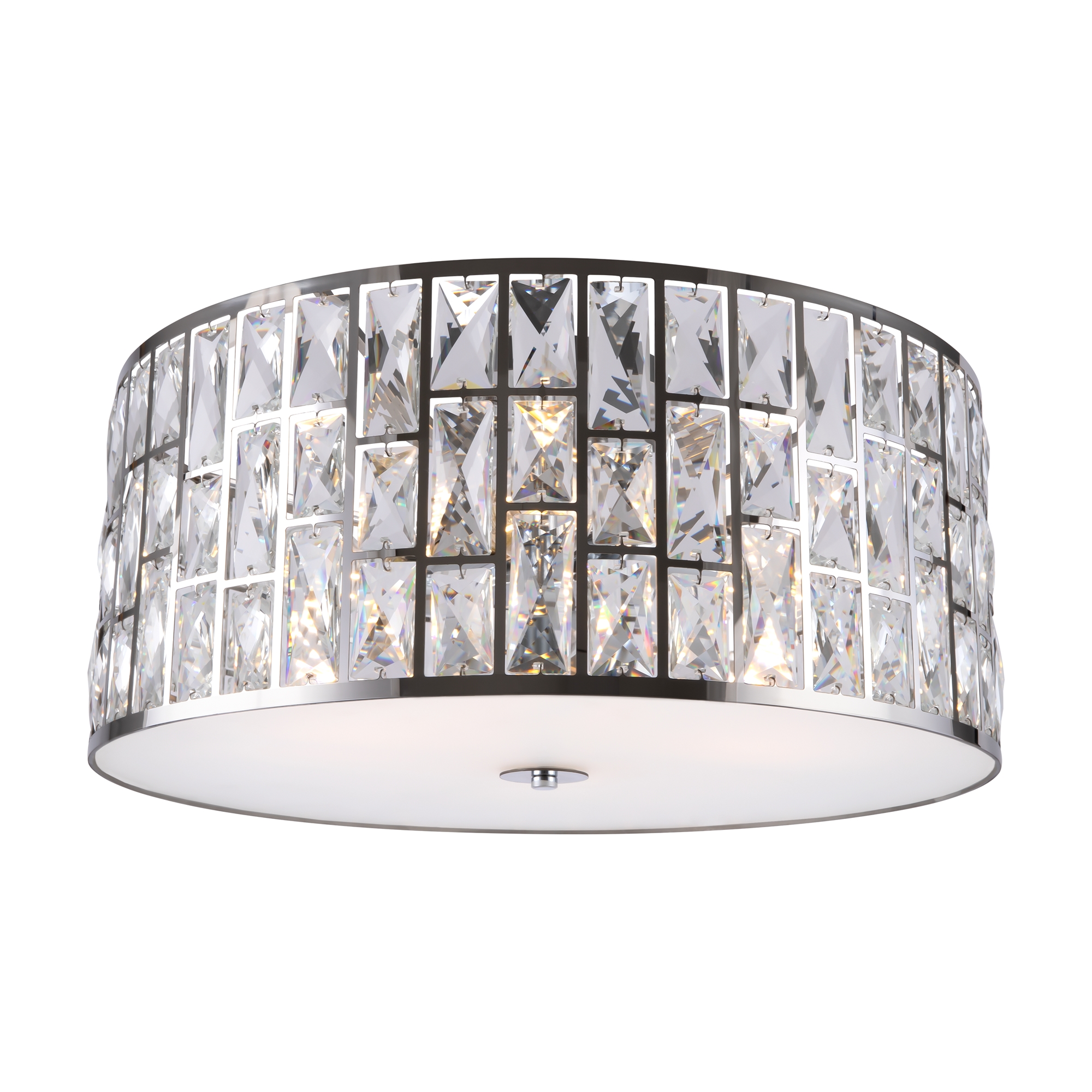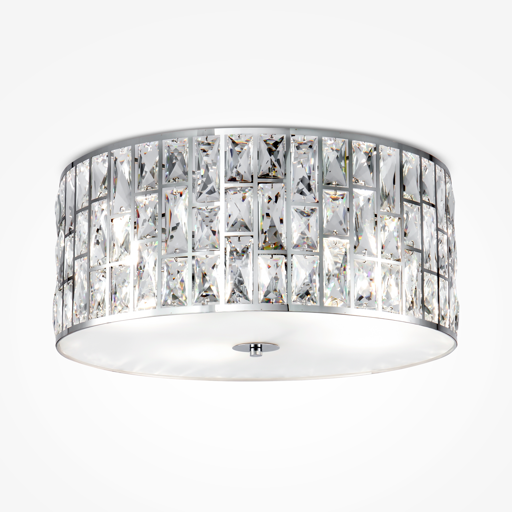 Металлическая арматура, цвет – хром. Каркас абажура – металл, декор – прозрач ный хрусталь. Потолочные модели с рассеивателем из матового стекла. Высота подвесных светильников регулируется.