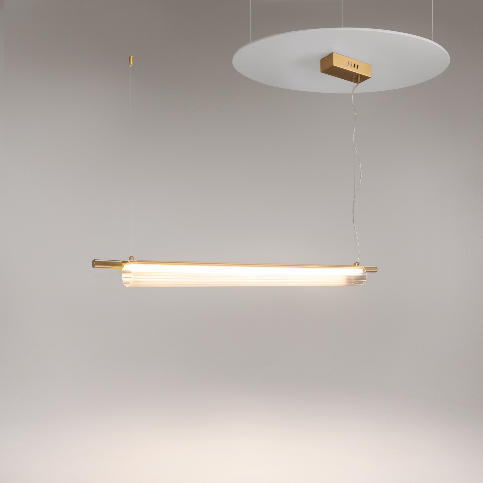 Арматура из металла, цвет — латунь с сатиновым финишем. Плафон из рифленого прозрачного стекла. LED-источник света. Теплая цветовая температура 3000К. Регулируемый по длине провод 3 метра у подвесного светильника. Подходит для помещений с высокими потолками. Торшер с push-кнопкой на проводе для удобного включения и выключения.